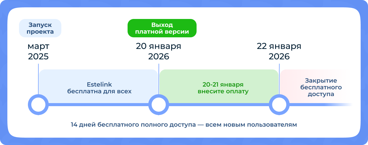 С 20 января 2026 года наша система переходит на платную подписку. Если вы ещё не начали пользоваться Estelink — сейчас идеальное время познакомиться с её возможностями.