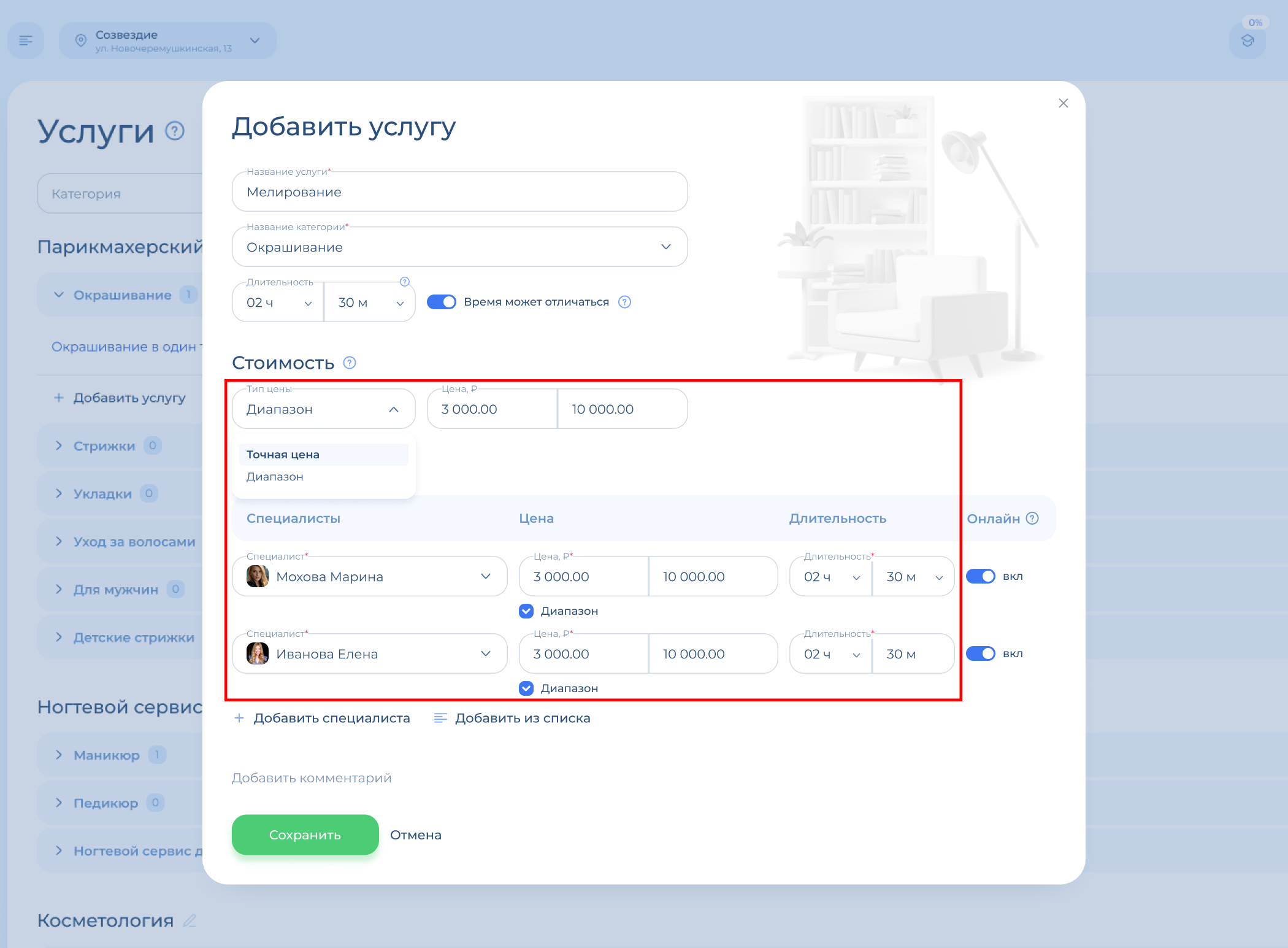 Теперь можно назначить цену и длительность услуги один раз, и система автоматически применит эти параметры ко всем специалистам.