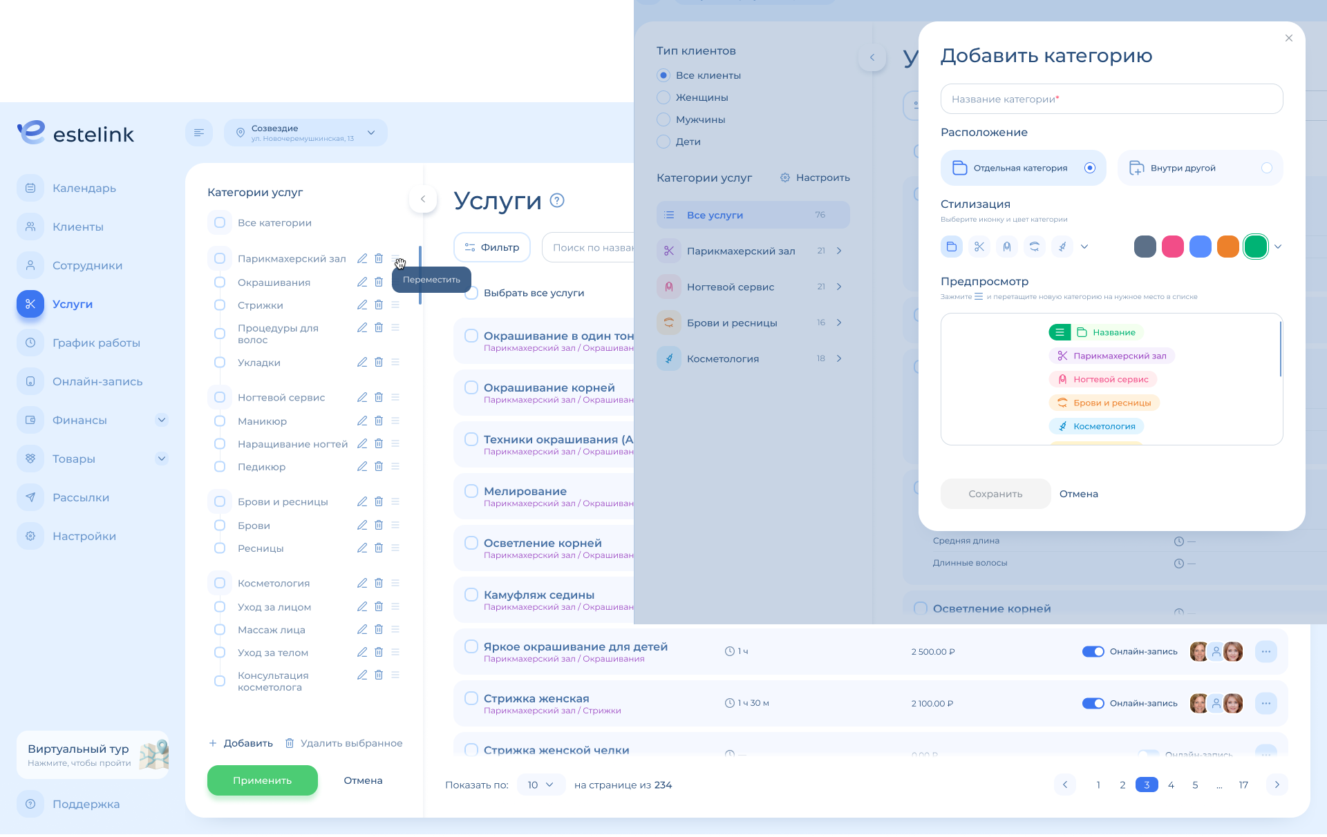 Категории с подкатегориями: например, категория «Парикмахерский зал», внутри нее подкатегории «Окрашивание», «Стрижки», «Укладки» и т. д. И уже в них лежат услуги.