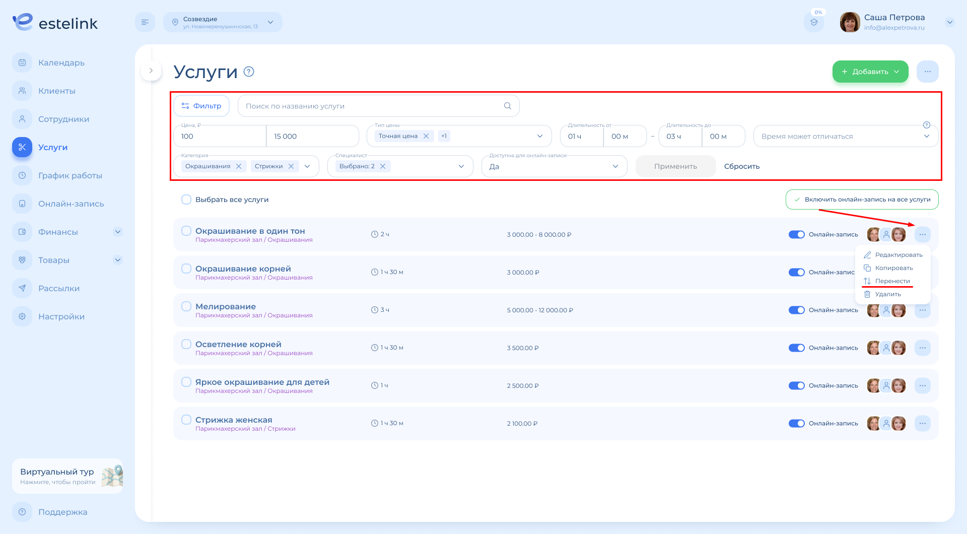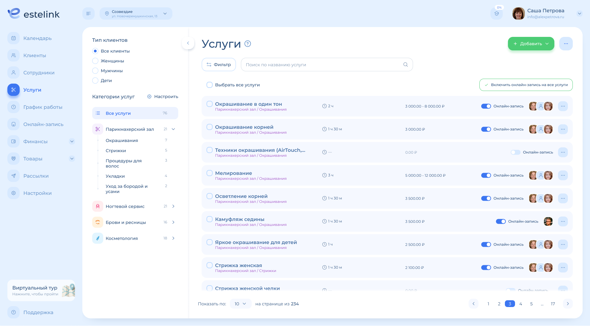 Услуги — это раздел, нужный всем салонам. Именно здесь формируется меню услуг, которое используется для записи клиентов: онлайн и через администратора.