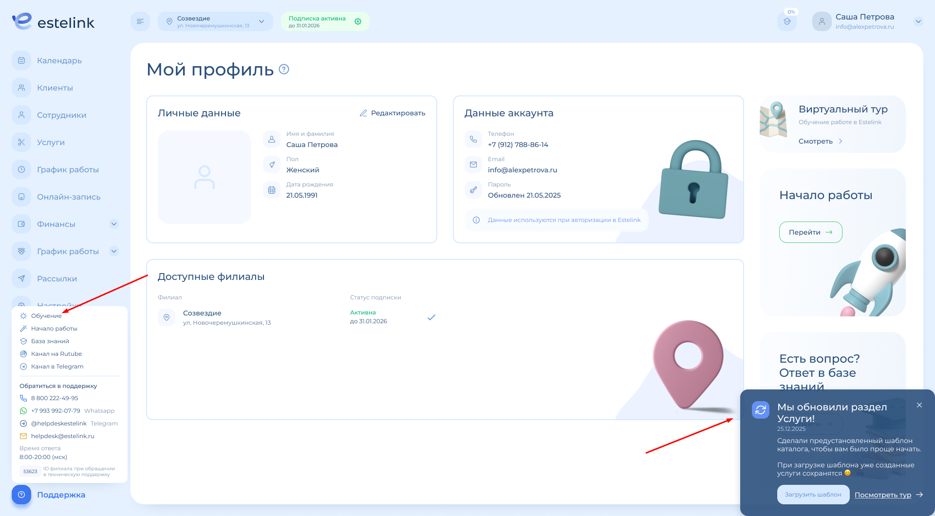 Виртуальный тур по новым услугам — включите его из уведомление или со страницы «Обучение»: