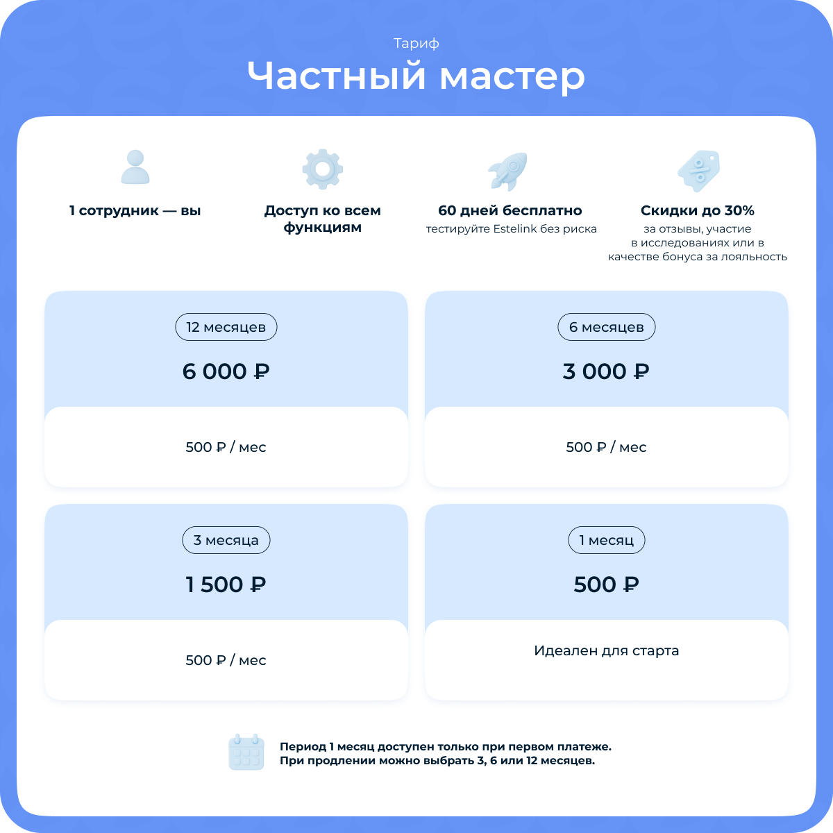 Но сейчас вносить оплату не нужно — теперь в Estelink доступен 60-дневный бесплатный период. Мы ценим вашу обратную связь и благодарны за все вопросы, идеи и предложения — поэтому решили дать больше времени на изучение возможностей системы и выбор идеального тарифа.