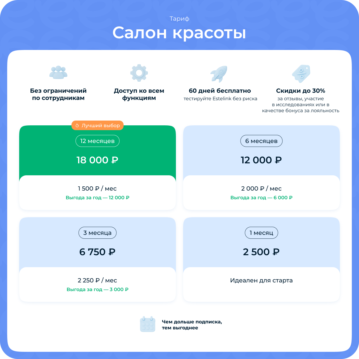 После оплаты по любому из тарифов у вас останутся все возможности системы Estelink — без ограничений по модулям и разделам. Тарифы отличаются только количеством сотрудников.