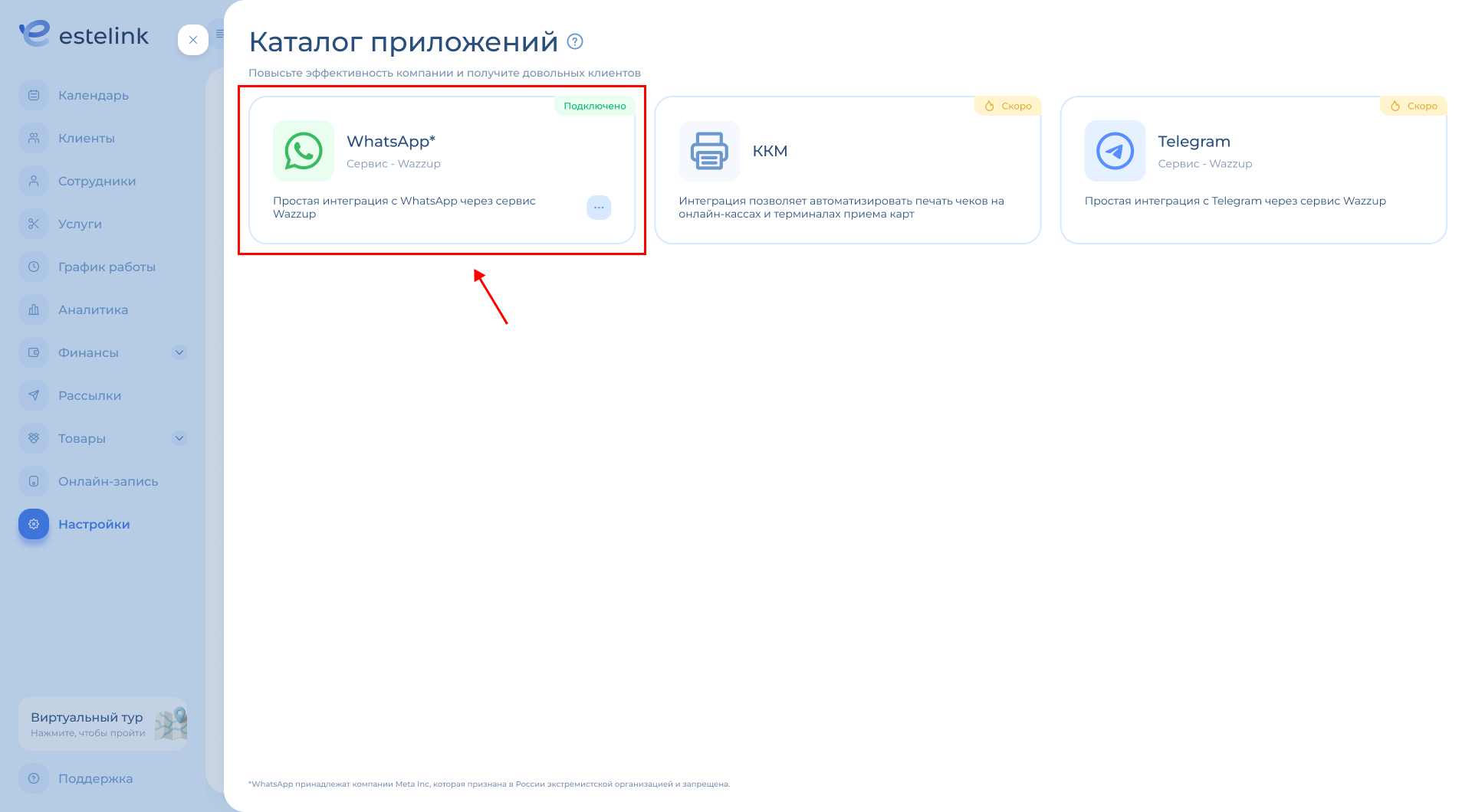 Для этого, откройте раздел «Настройки» в меню слева и нажмите на «Перейти» в «Интеграциях». В открывшемся окне нажмите на «WhatsApp».