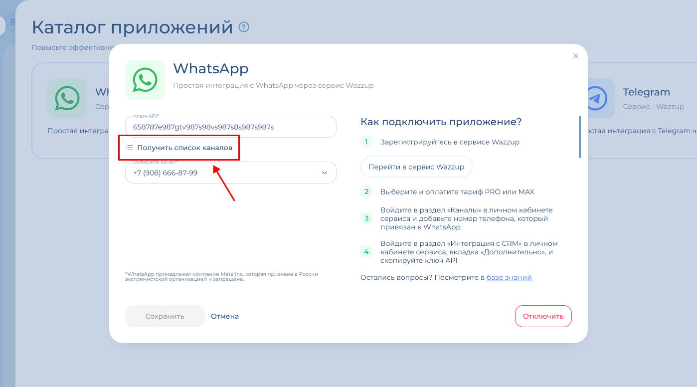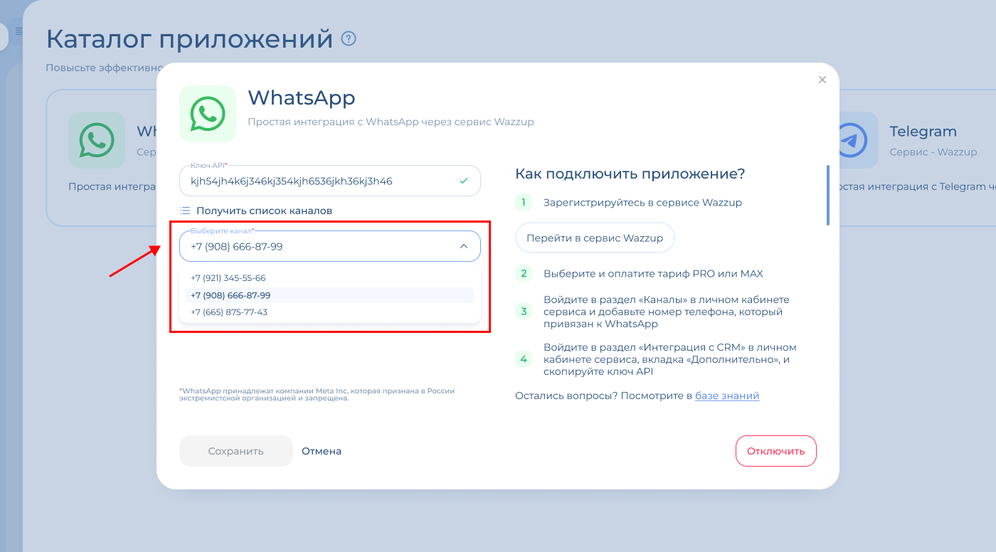 Если нужного канала нет в списке, значит он не добавлен в личном кабинете сервиса Wazzup. Добавьте его, а затем вернитесь к выбору канала в Estelink: