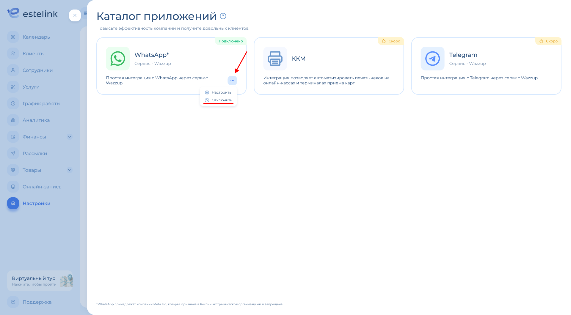 Если вы хотите отключить интеграцию с WhatsApp, перейдите в раздел «Настройки» — «Интеграции».