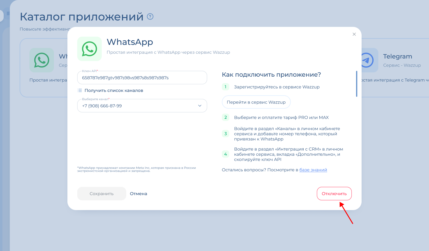 Если нажать на «Настроить» или просто на WhatsApp, от откроется окно настройки интеграции. В нем также можно нажать на «Отключить».