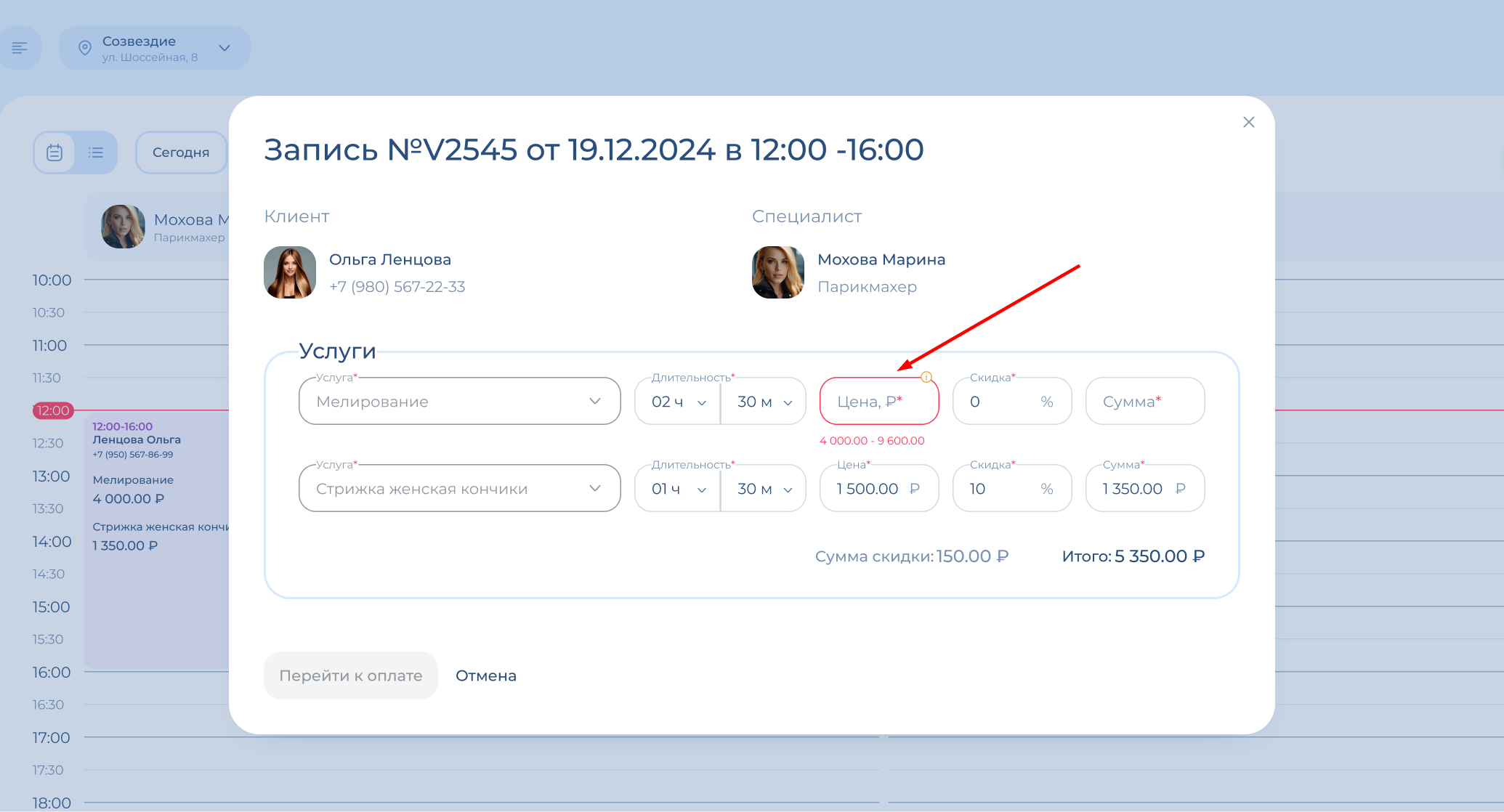 Проверьте цену услуг. Если была указана цена в диапазоне, введите здесь финальную стоимость услуги. Затем нажмите «Перейти к оплате».
