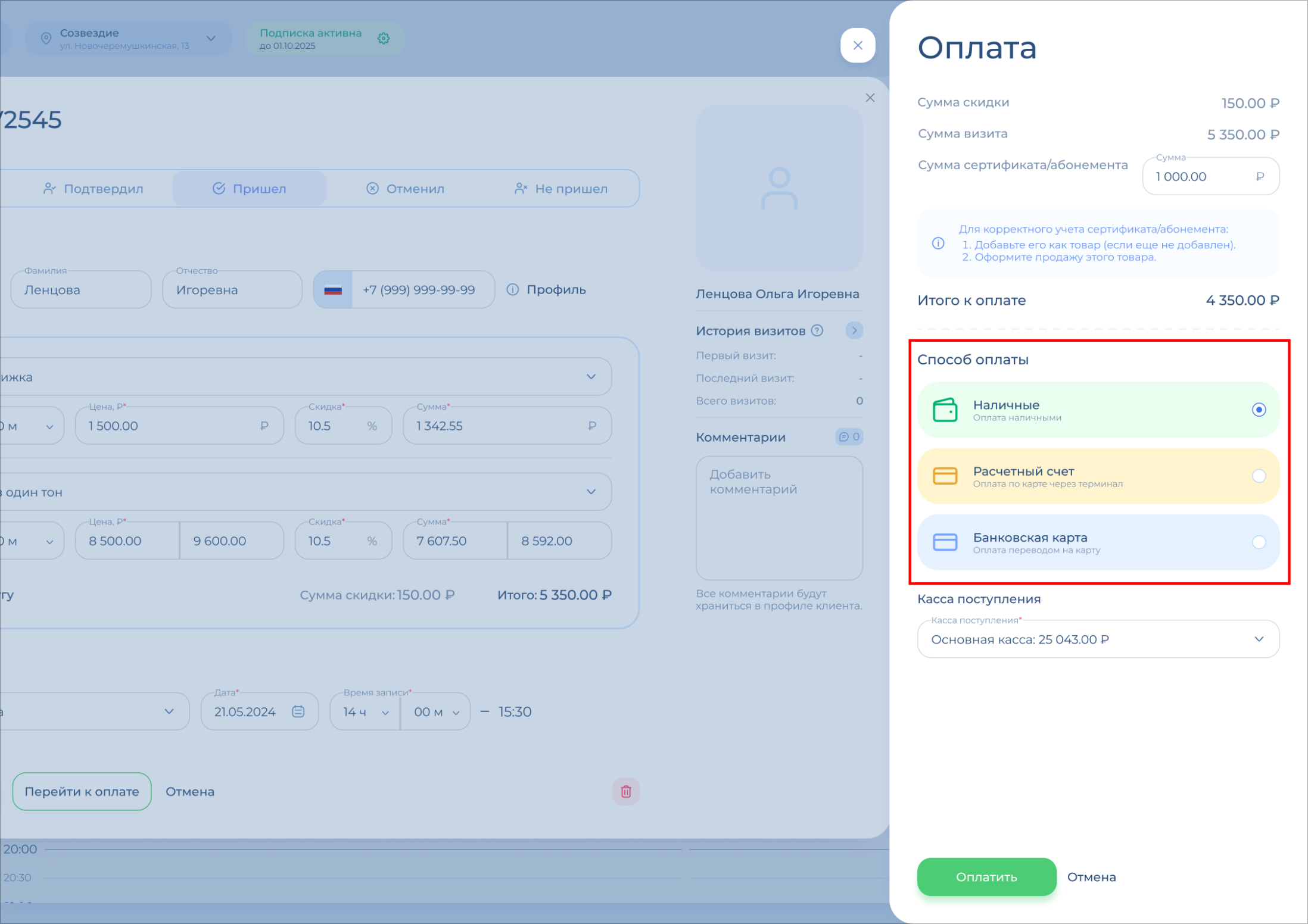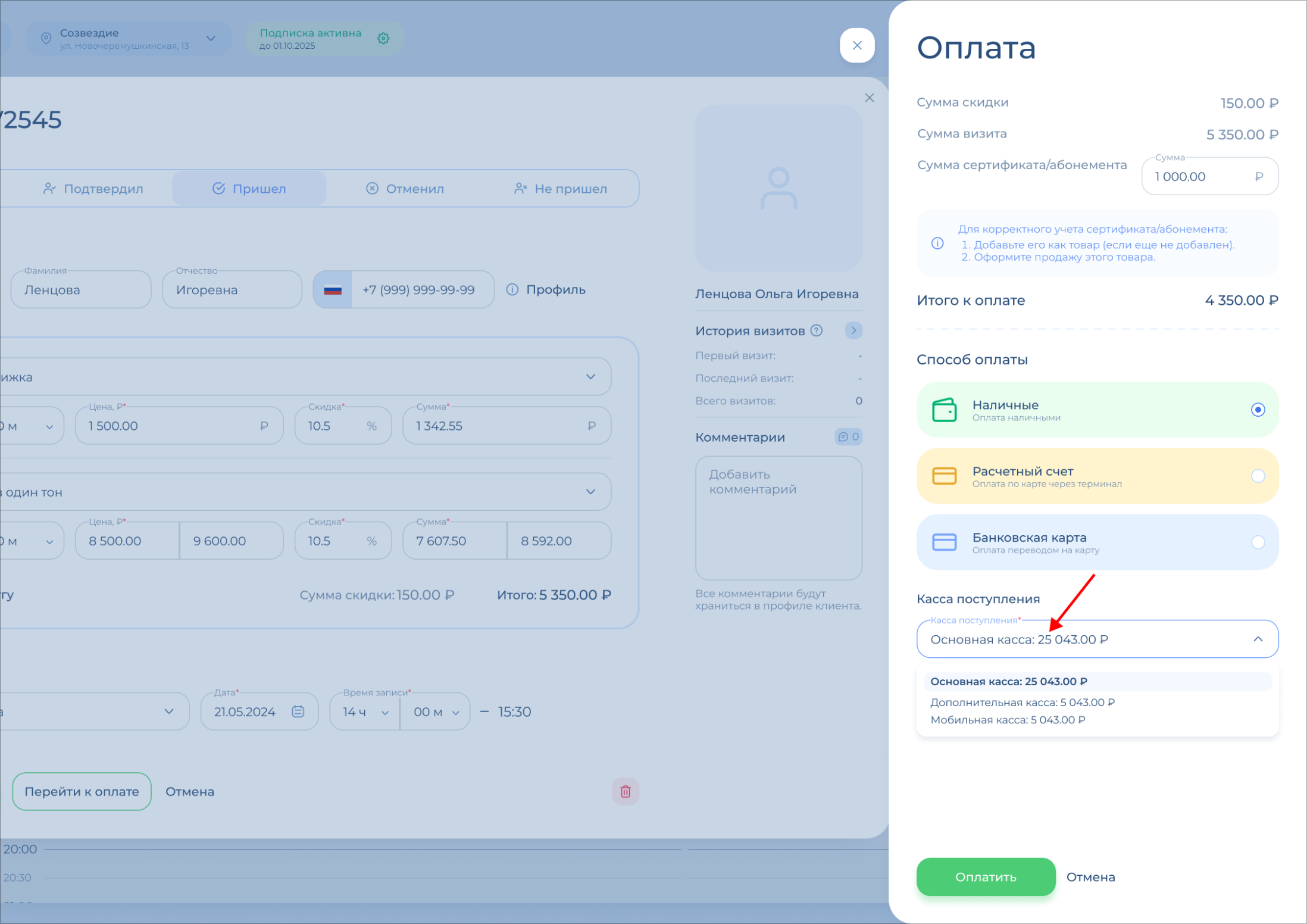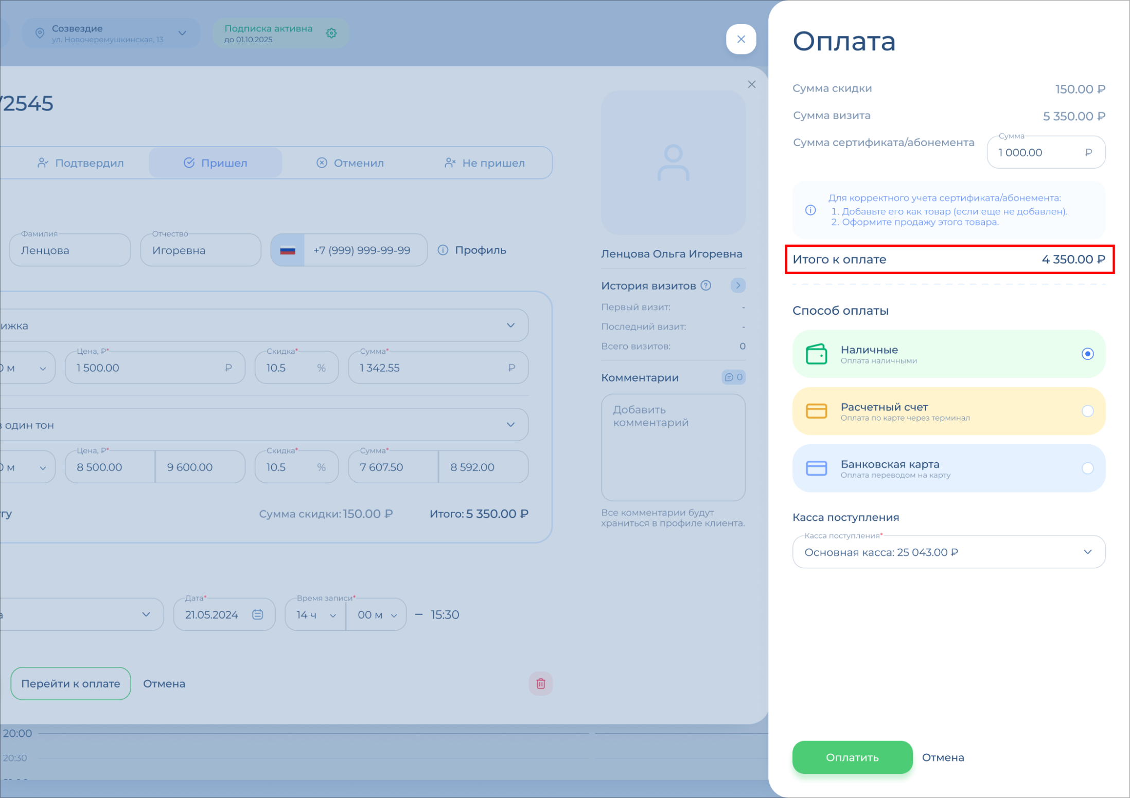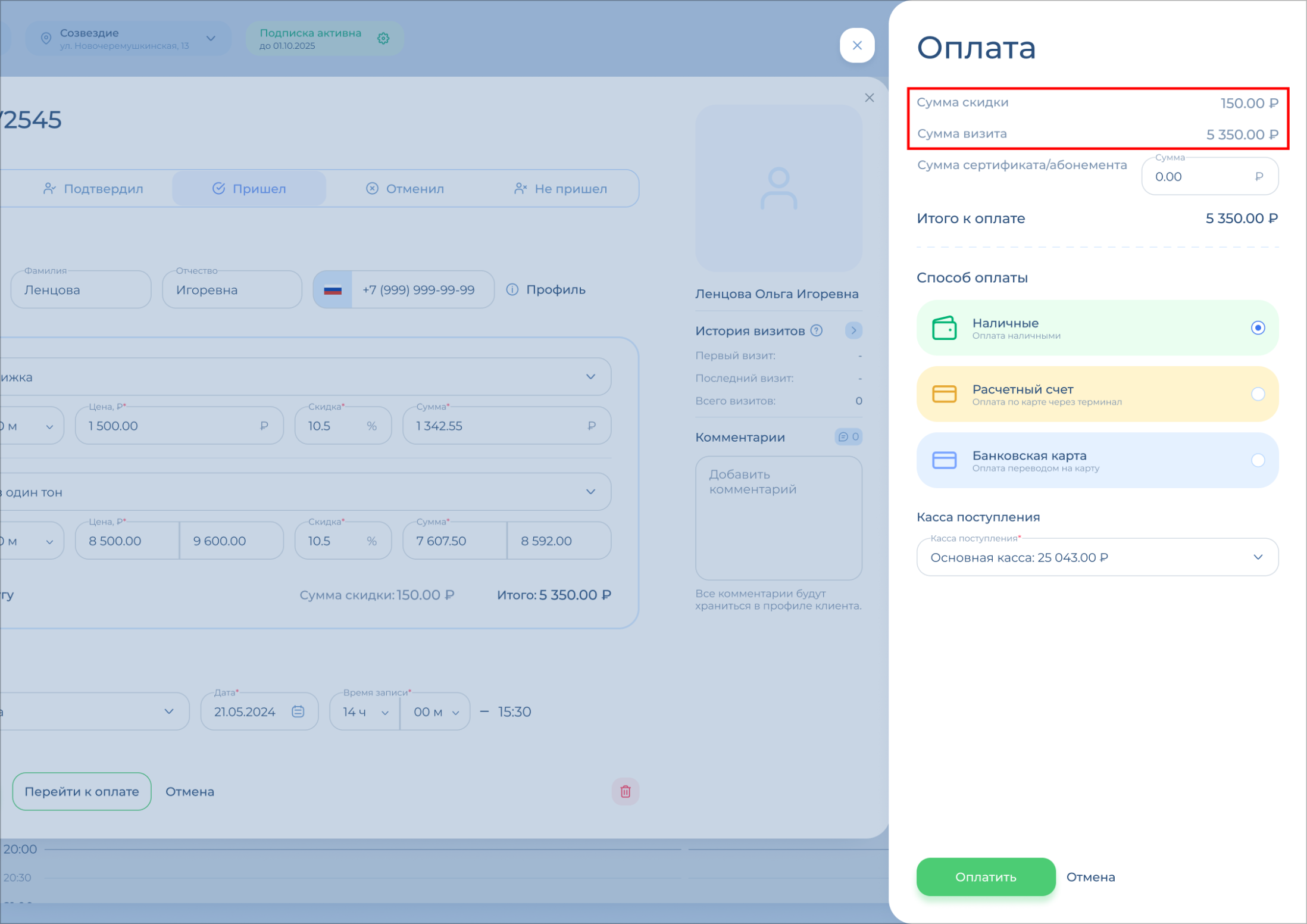 Откроется окно оплаты. Вверху указаны сумма скидки и сумма визита, проверьте их.