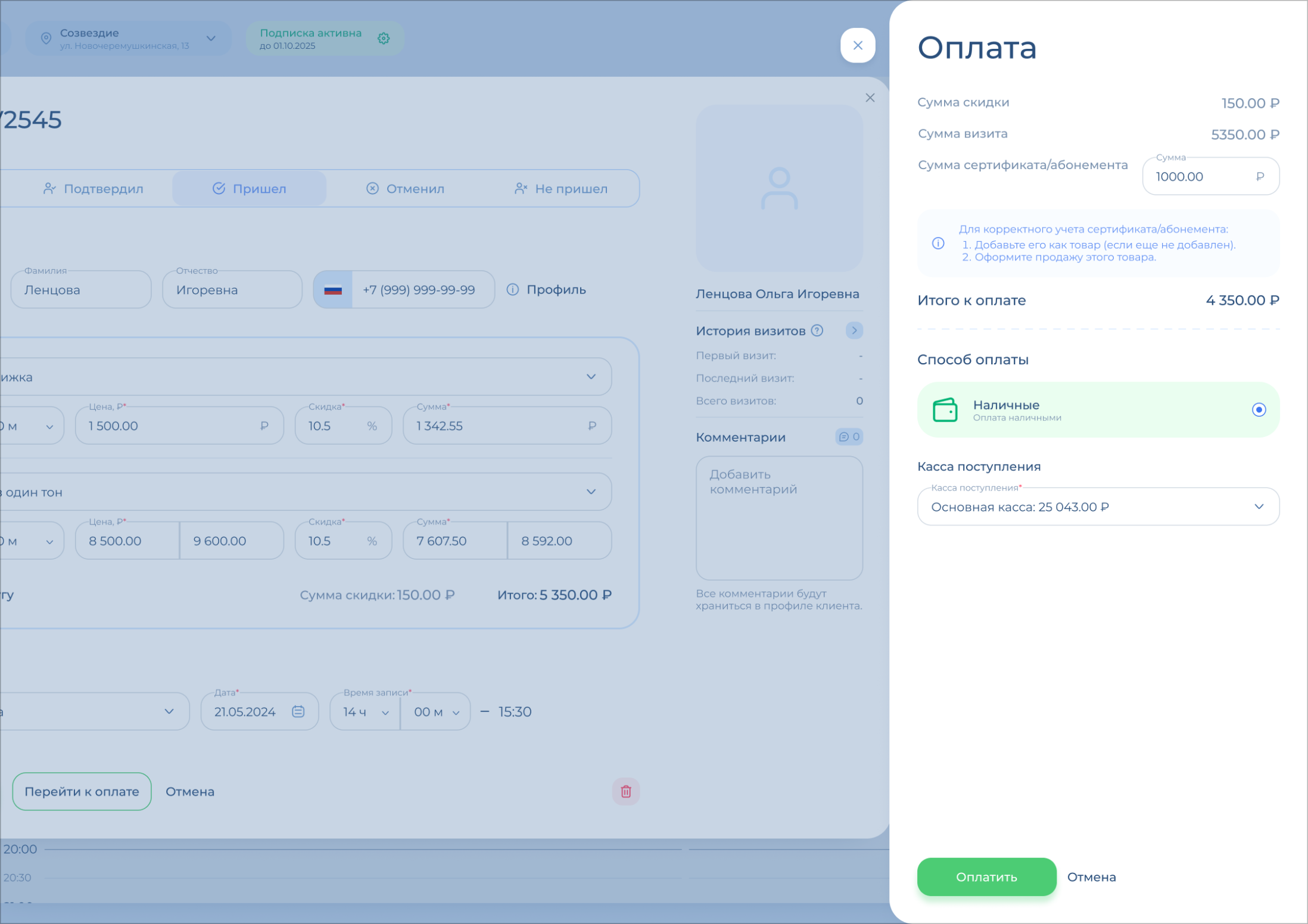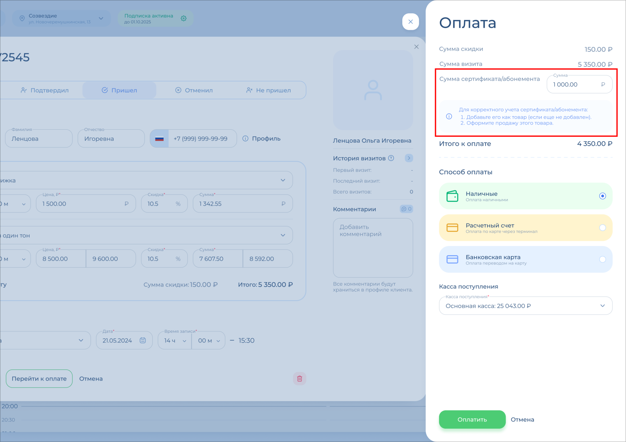 Вы можете указать, что часть визита или весь визит оплачивается сертификатом или абонементом. Для этого введите сумму такой оплаты в поле «Сумма сертификата/абонемента».