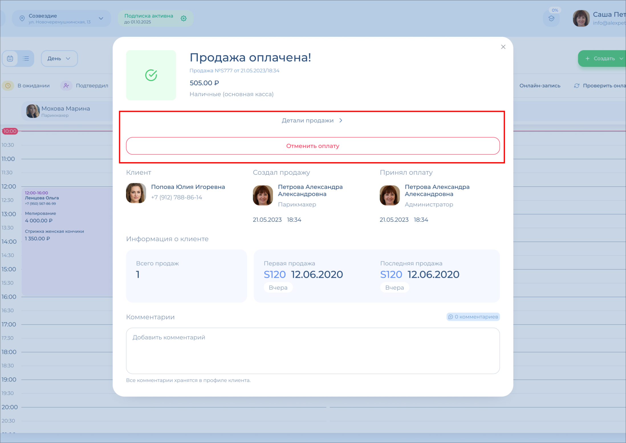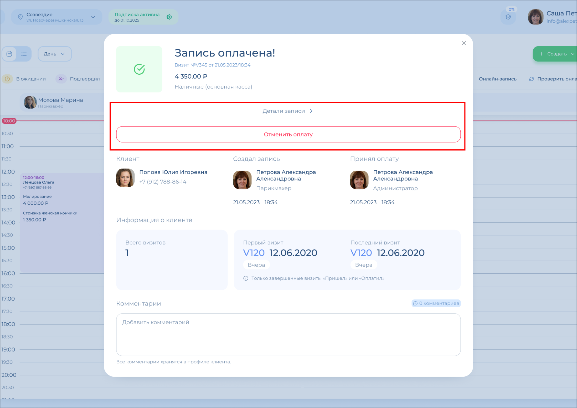 При отмене оплаты отменяется поступление средств на баланс кассы/счета/карты, отменяется финансовая операция, запись клиента возвращается в статус «Пришел».