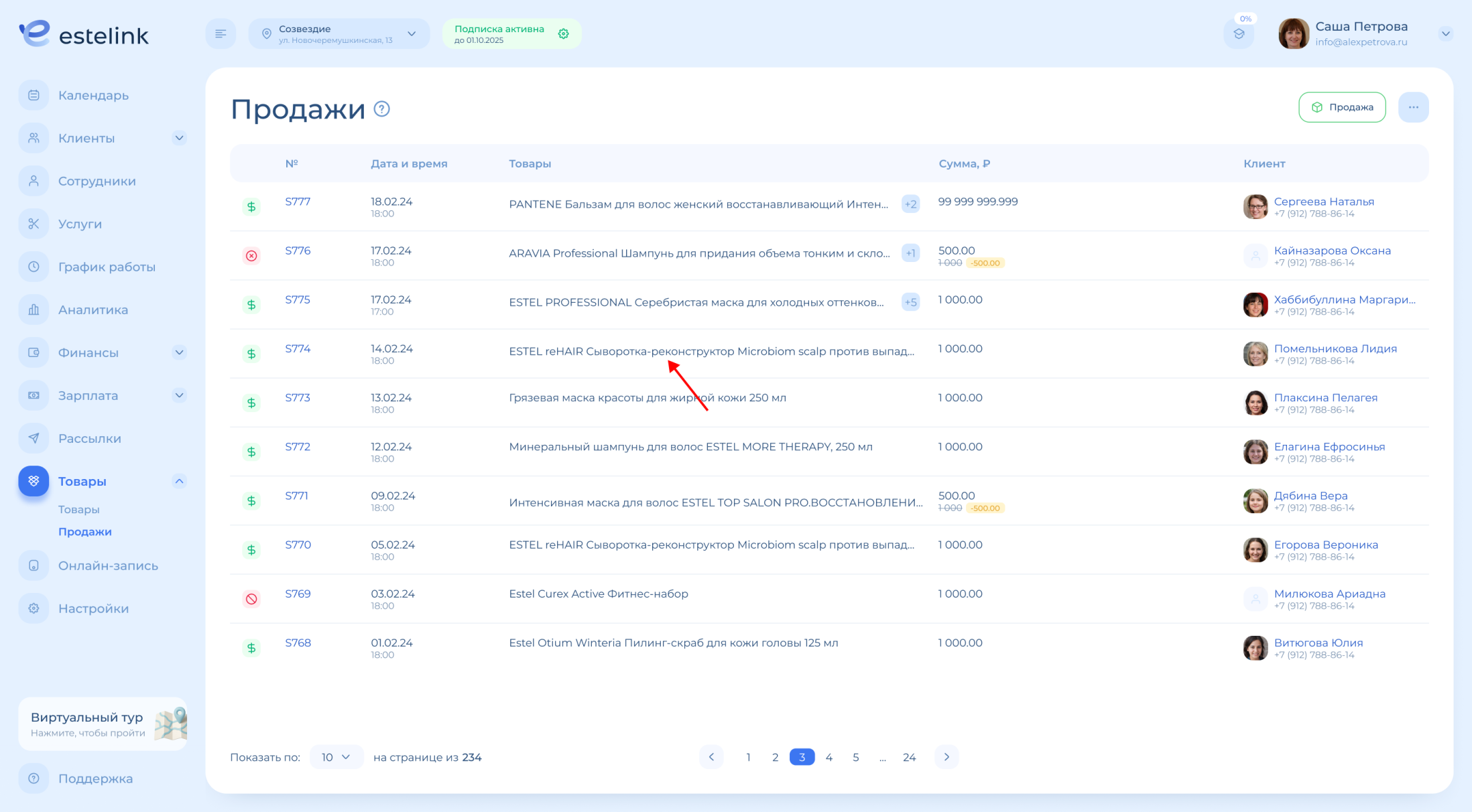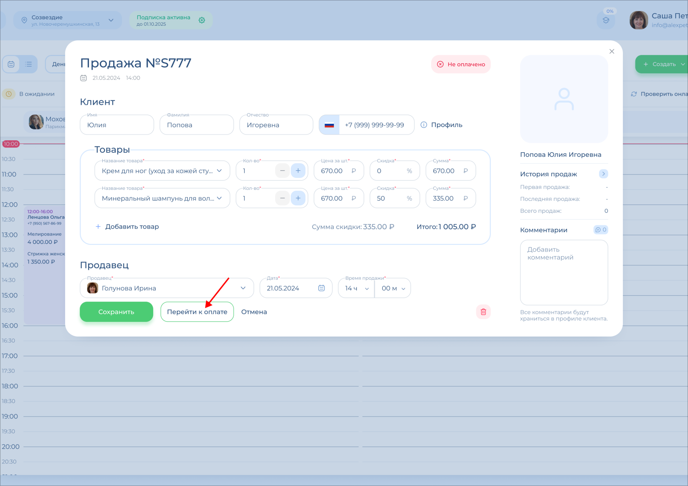 Проведение оплаты при продаже товара проходит таким же образом, как и при оплате визита, только переключение на статус «Пришел» не требуется.
