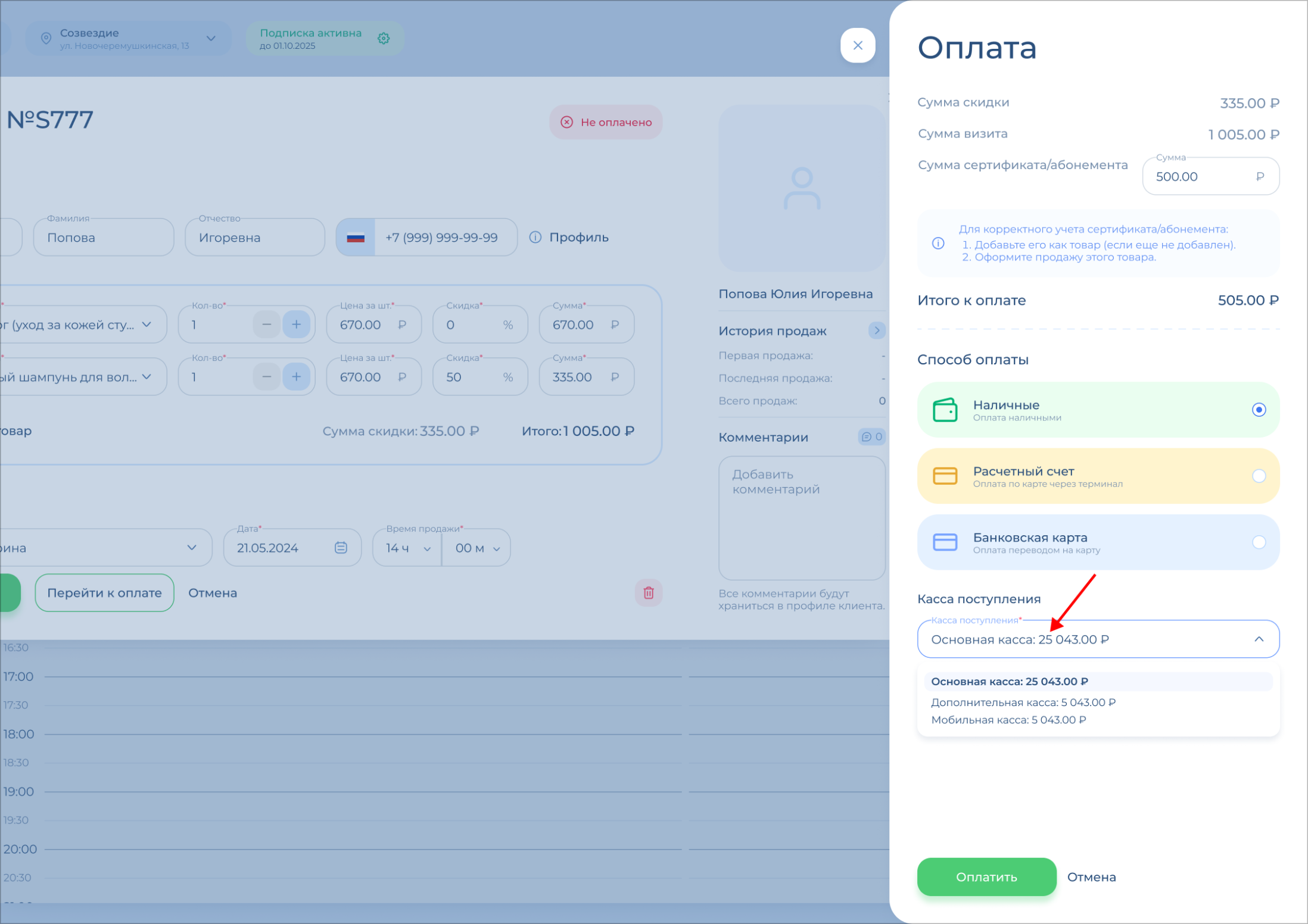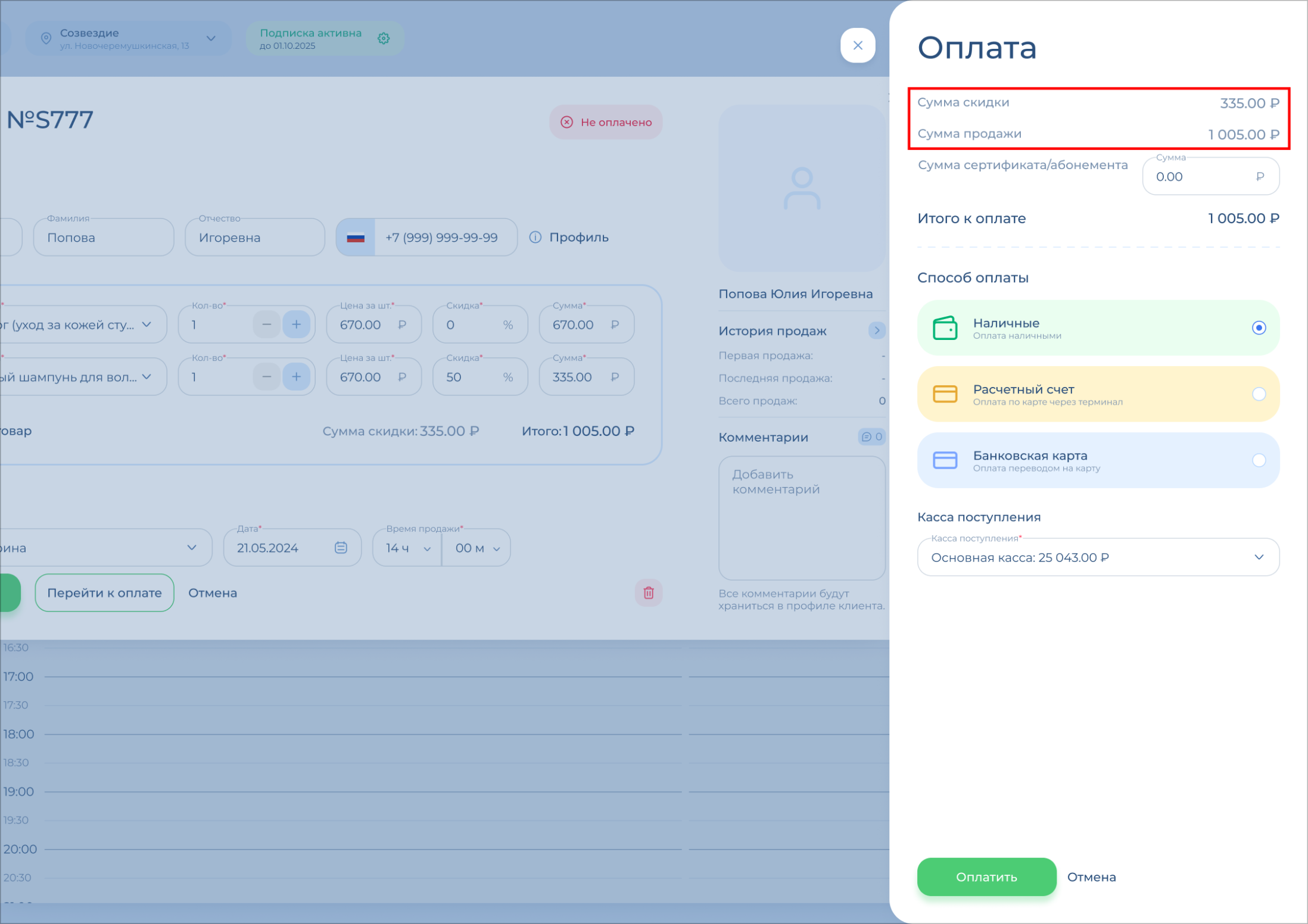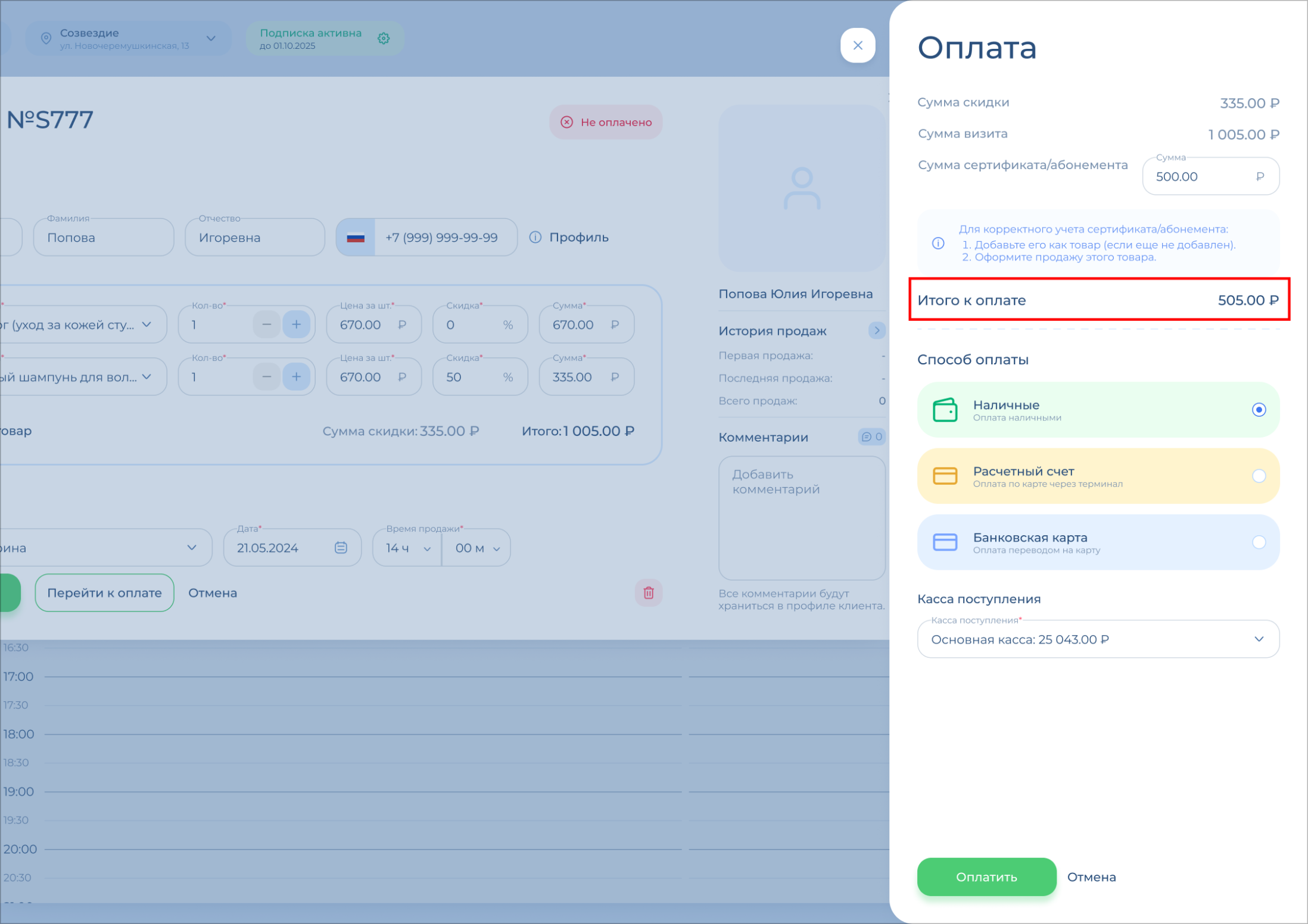 Проверьте поле «Итого к оплате» – это та сумма, которая поступит вам в кассу / на карту / на расчетный счет салона.