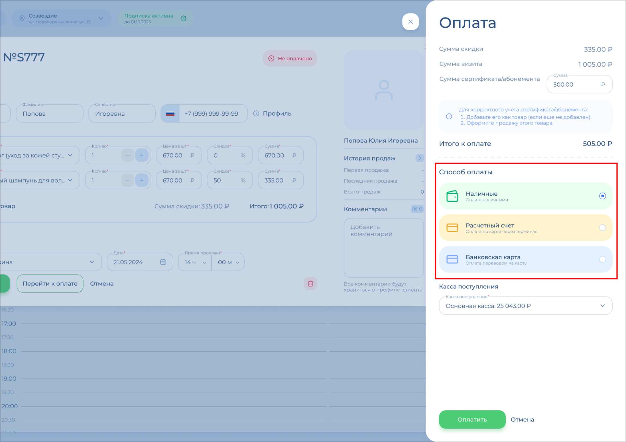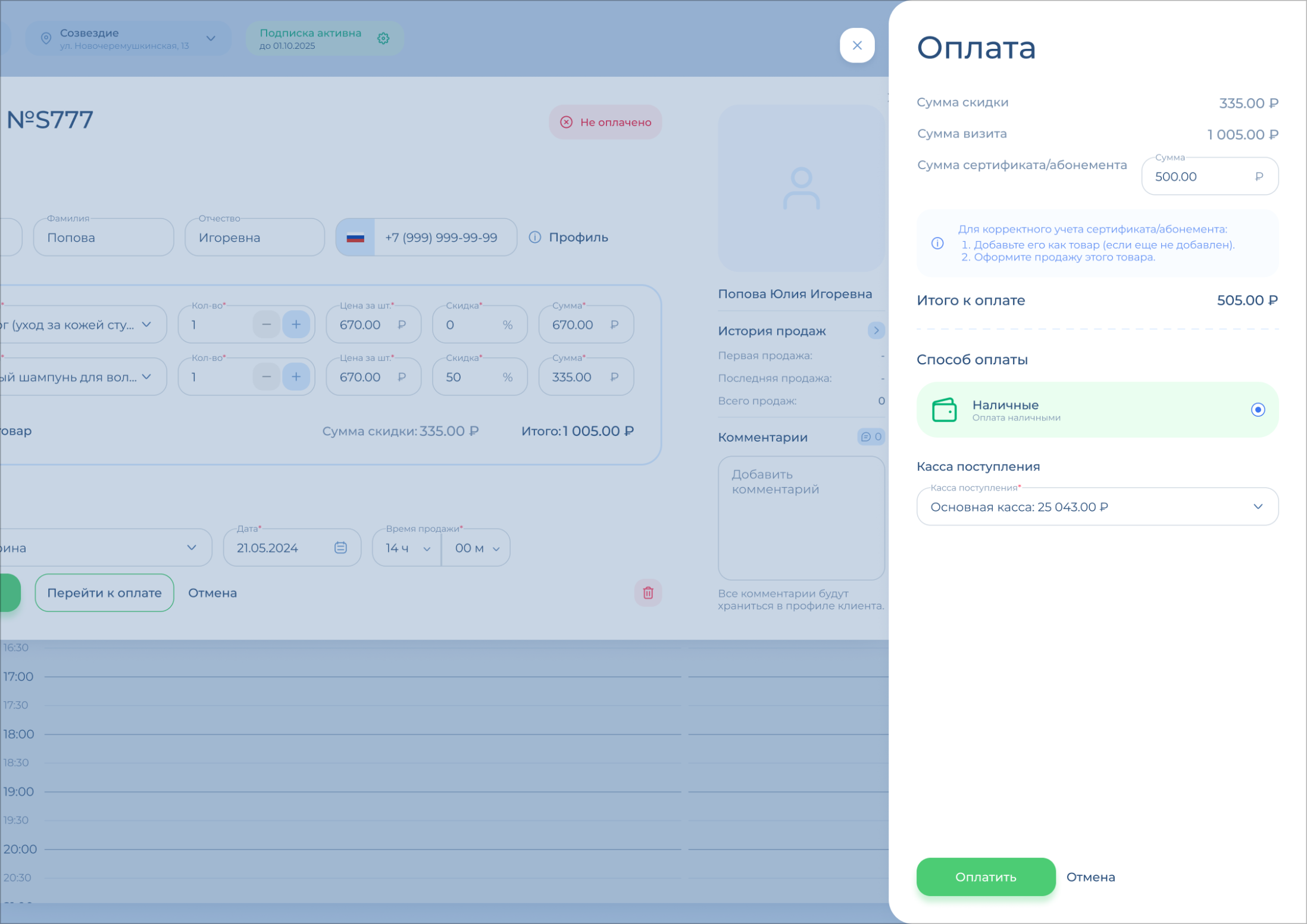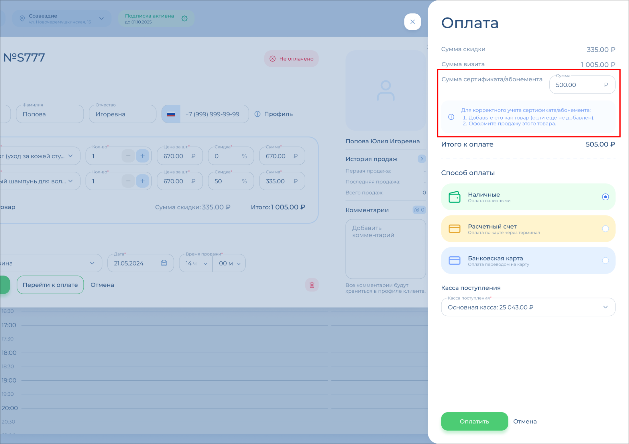 Проверьте поле «Итого к оплате» – это та сумма, которая поступит вам в кассу / на карту / на расчетный счет салона.