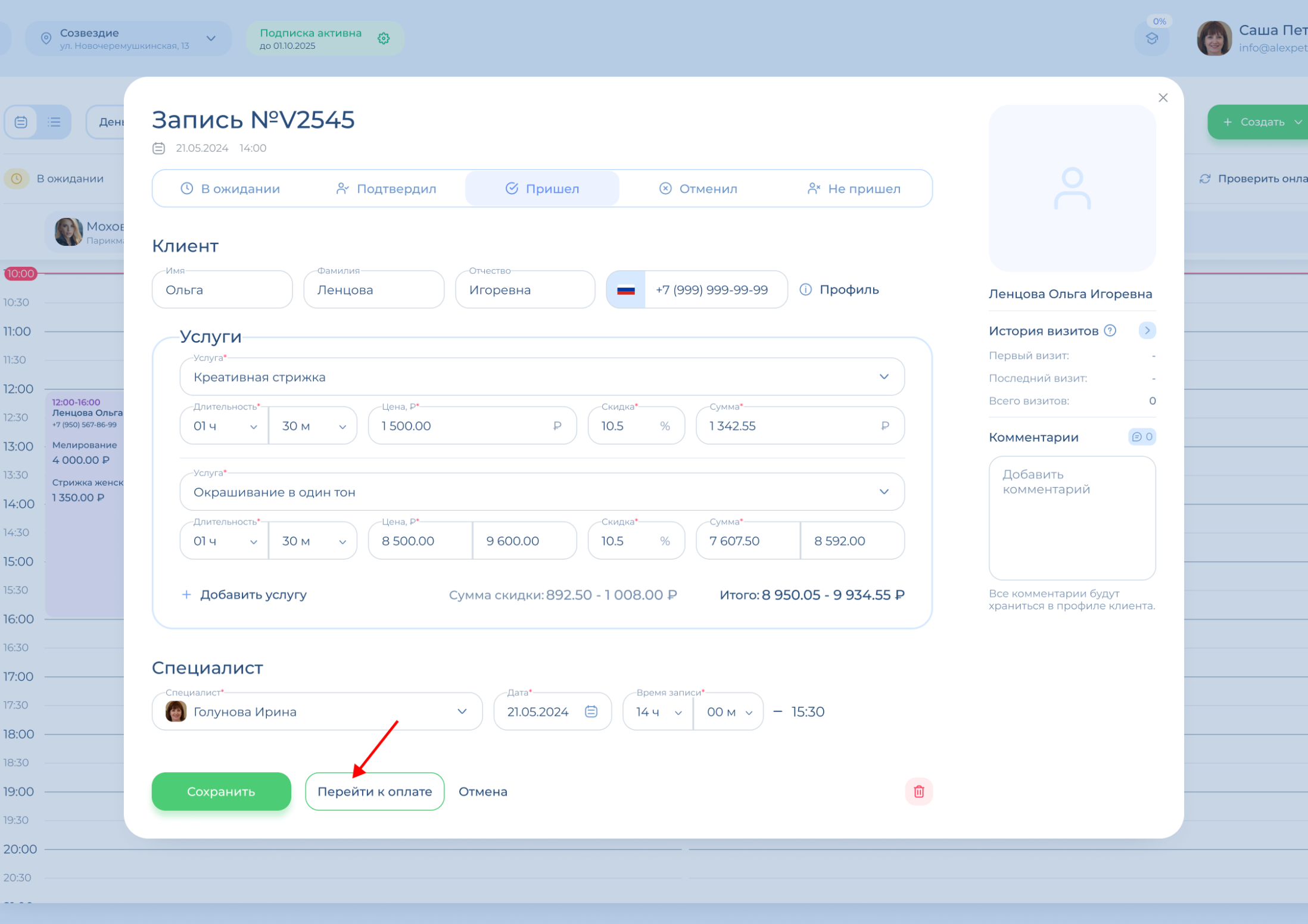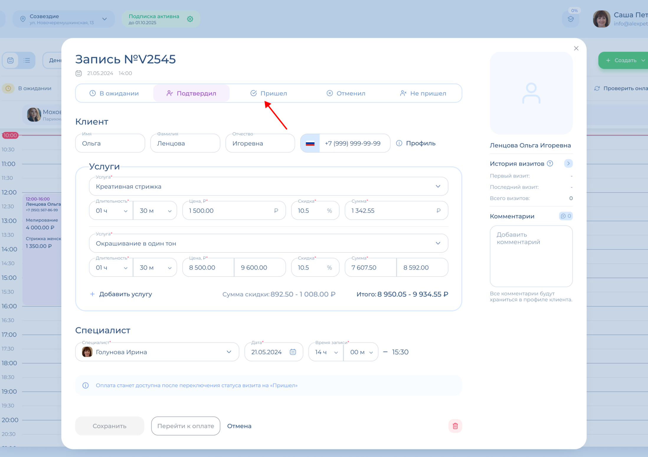 Проведение оплаты доступно для визитов, которые находятся в статусе «Пришел». Вы можете поставить этот статус сразу при создании записи или позже, уже после сохранения. После оплаты редактировать или удалять визит нельзя! Для этого надо будет отменить оплату.
