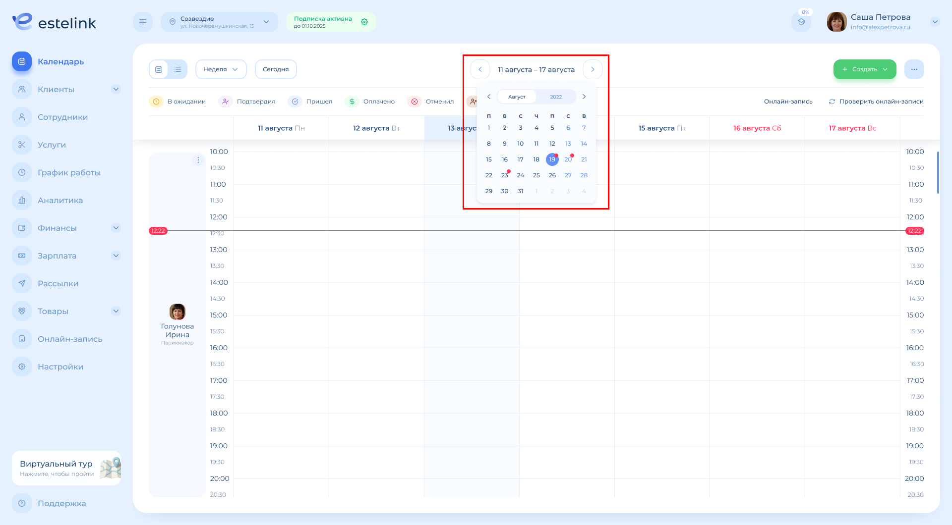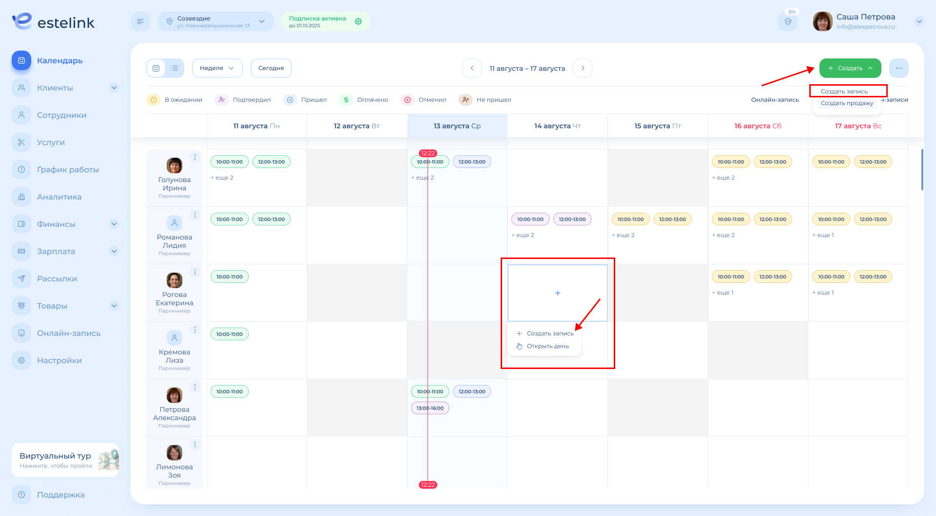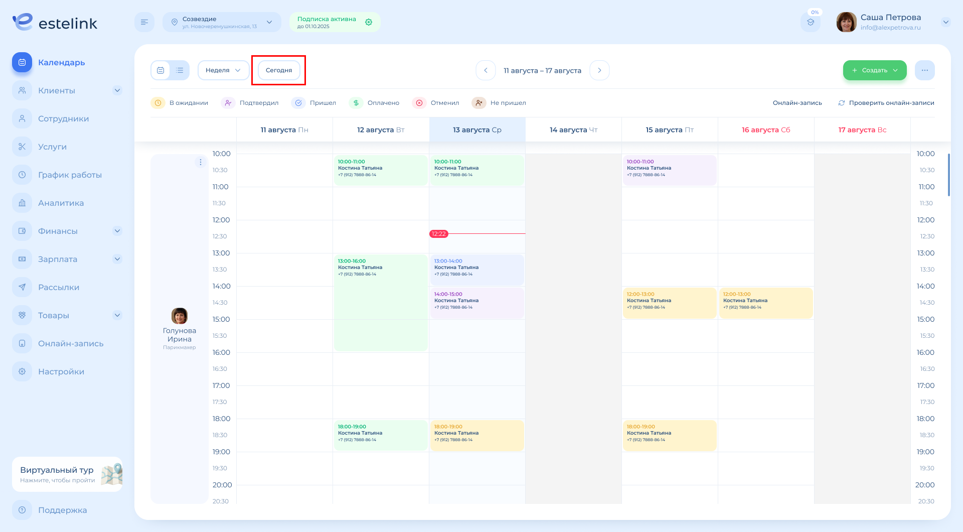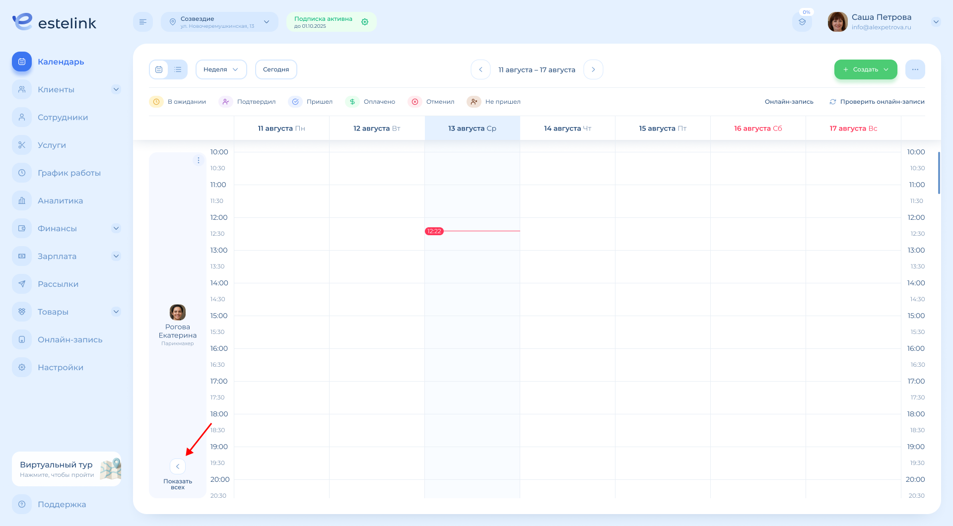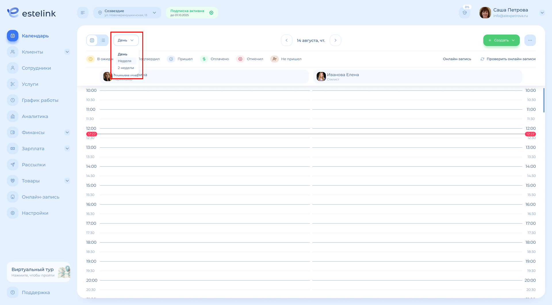 Обратите внимание: если в выбранном периоде («Неделя» или «2 недели») работает только один специалист, календарь будет выглядеть так же, как в режиме «День» (с временными слотами).