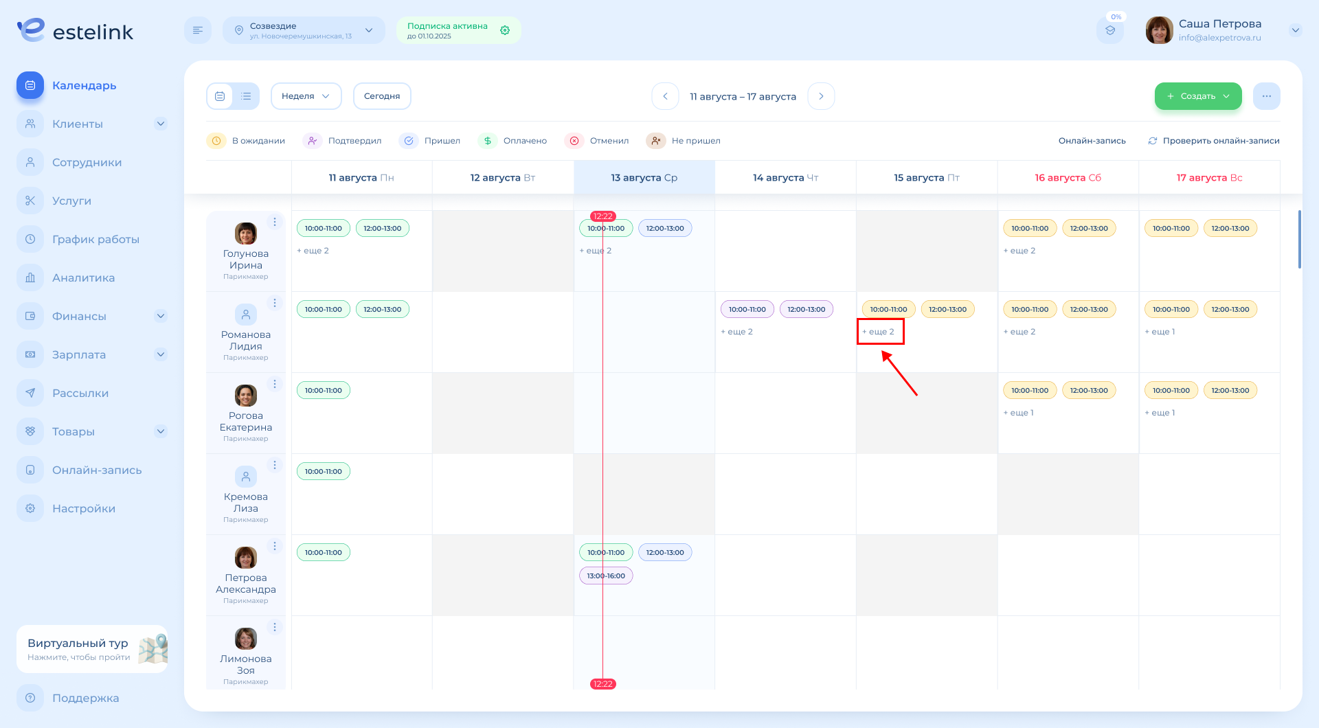 Если у специалиста в одной ячейке больше трёх визитов, появляется кнопка «ещё» и цифра, показывающее количество скрытых записей. Нажмите «ещё» — откроется окно со всеми визитами, назначенными специалисту.