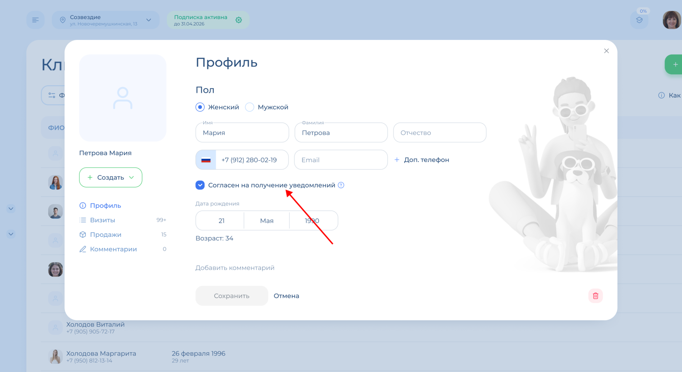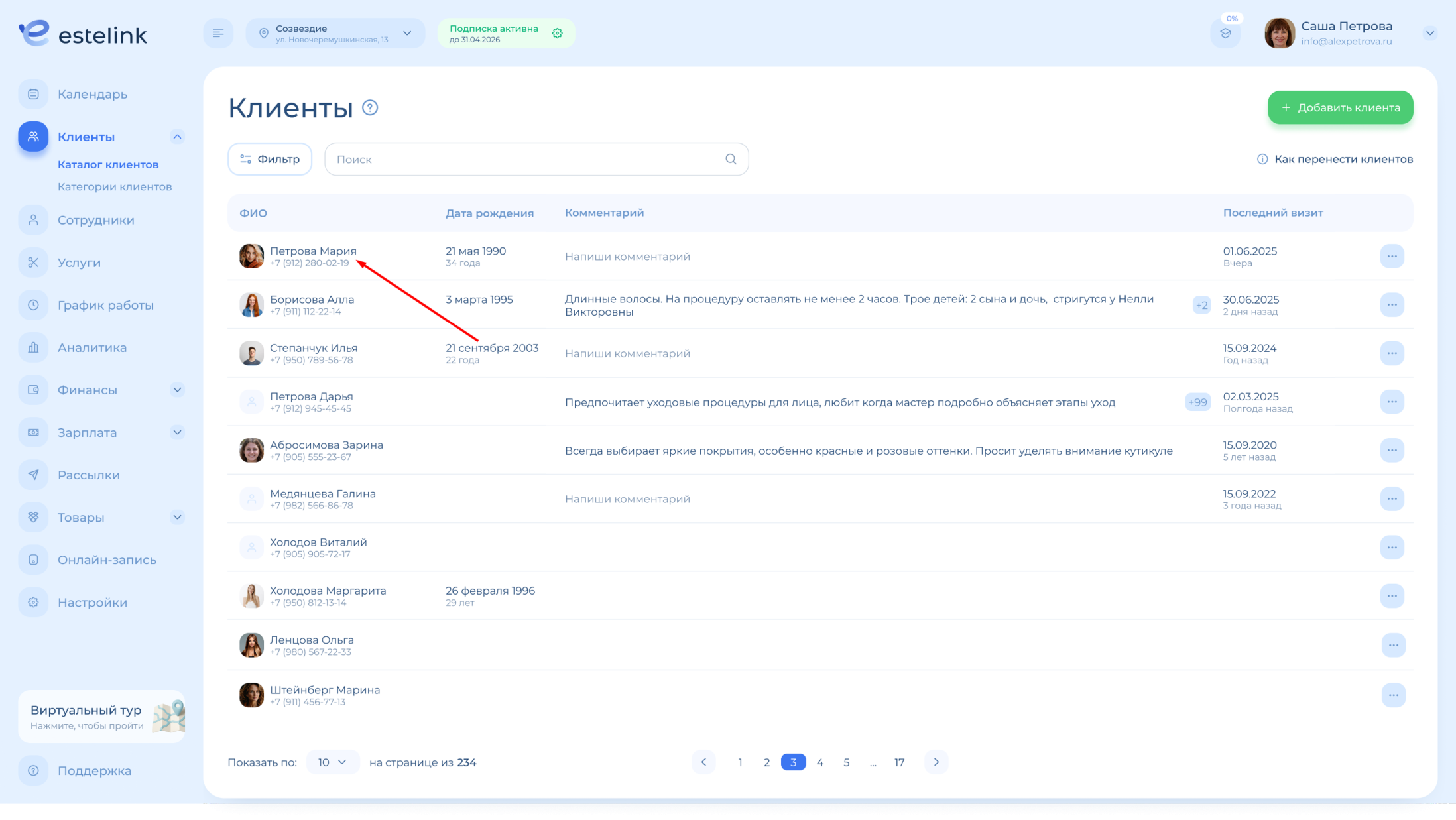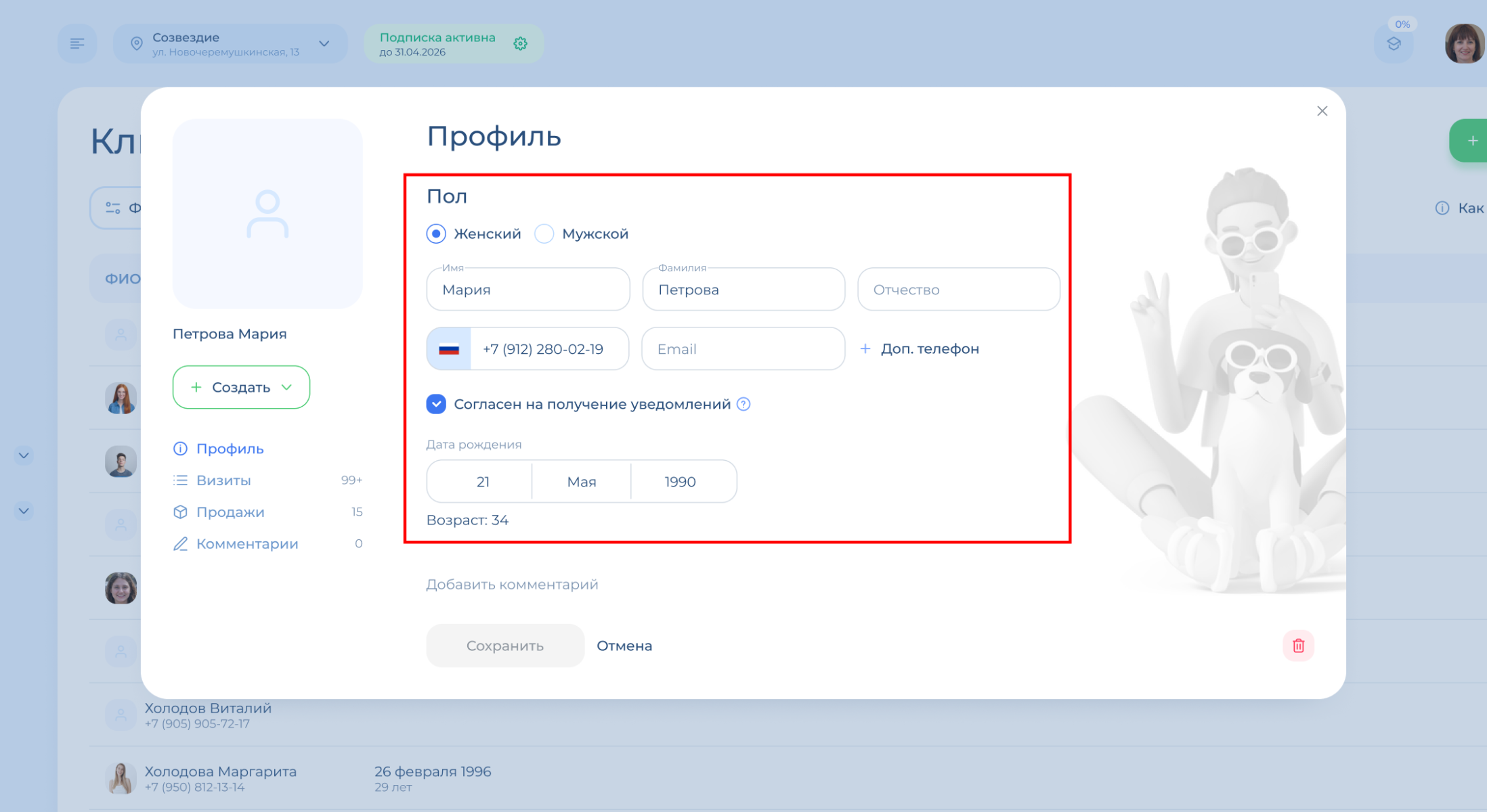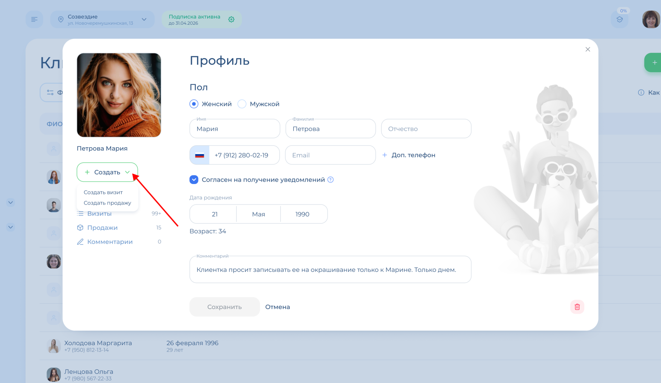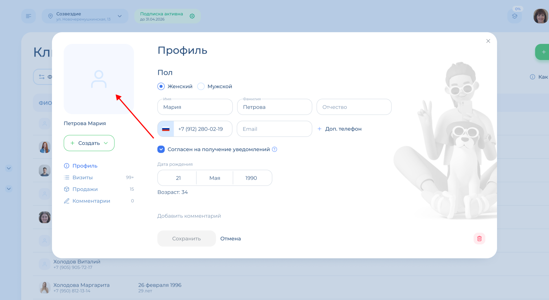 В профиле клиента вы можете посмотреть информацию по нему: контакты, имя, дату рождения. А также добавить комментарий и фото клиента.