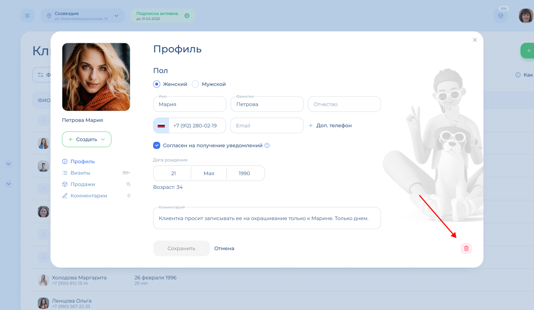 Чтобы удалить клиента, нажмите на значок корзины в правом нижнем углу. Если у клиента есть записи в любом статусе, то удалить его профиль нельзя!