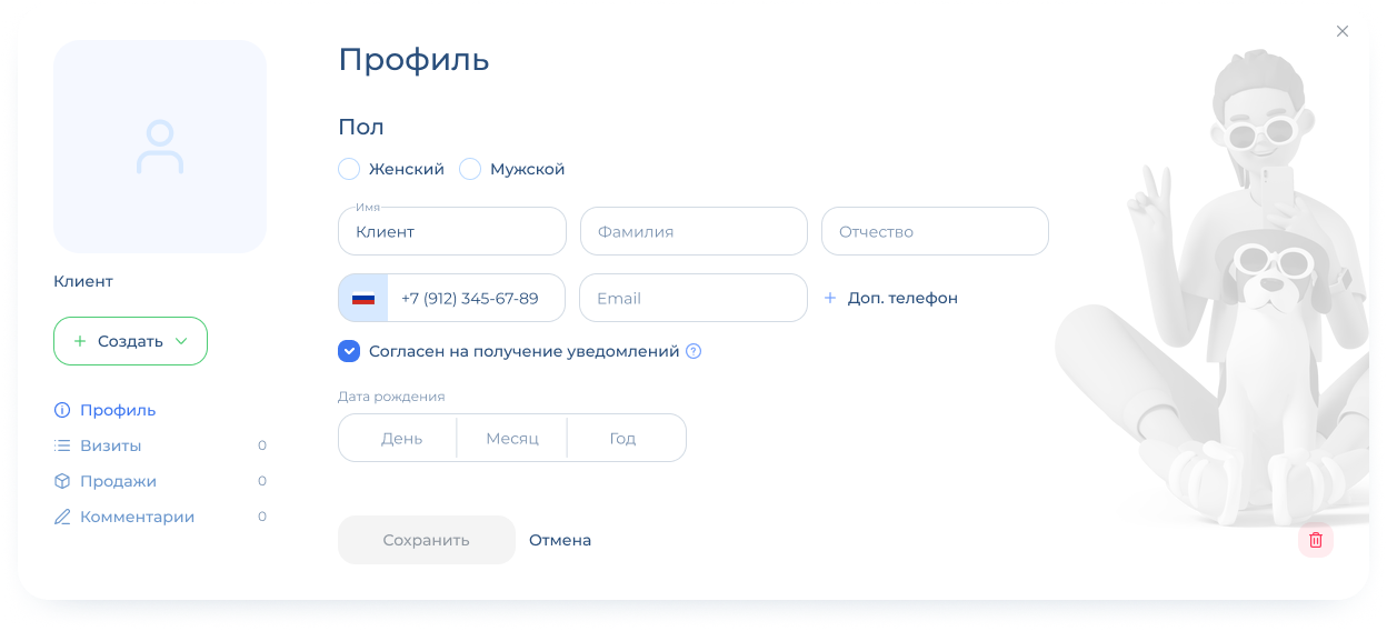 По желанию указываются: имя, дополнительный телефон, электронная почта, фамилия и отчество, дата рождения, пол клиента.
