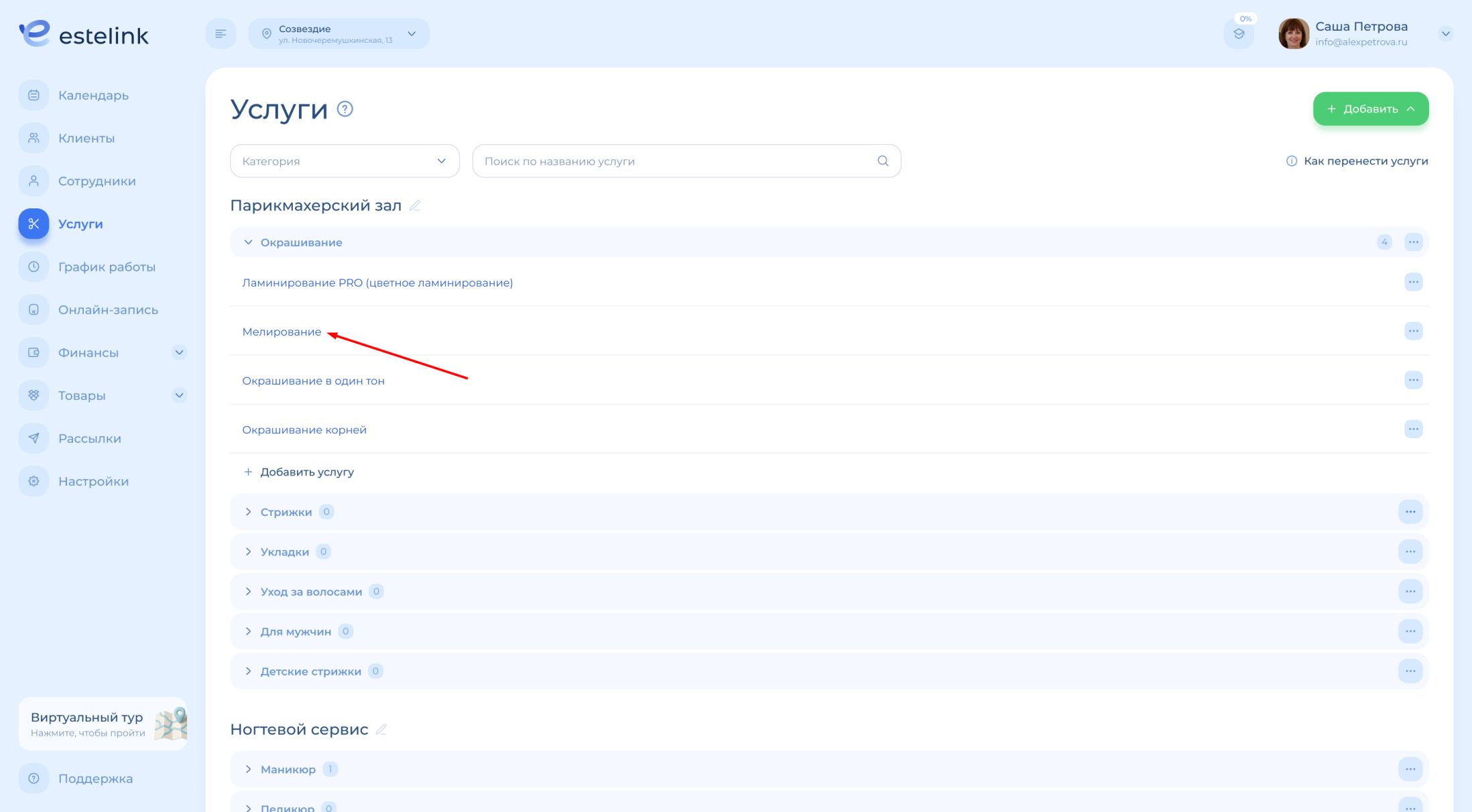 Перейдите во вкладку «Услуги» в меню слева и откройте карточку услуги.