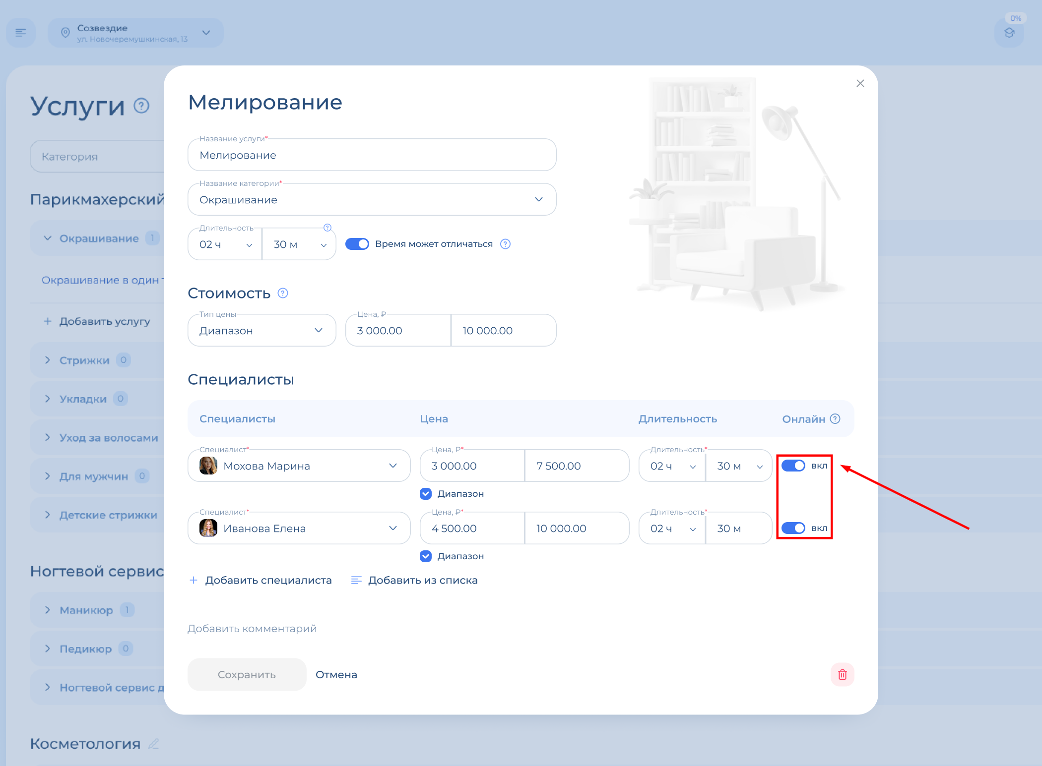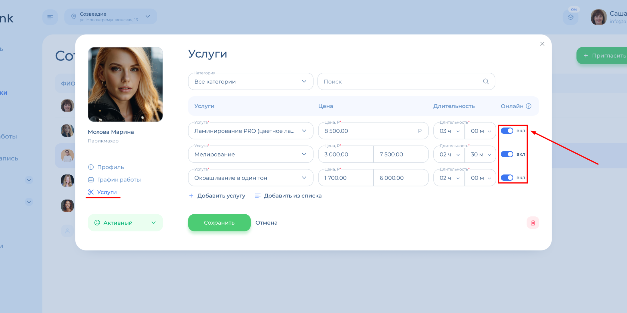 Шаг 1. Активируйте онлайн-запись на услуги — в профиля специалистов или в карточках услуг