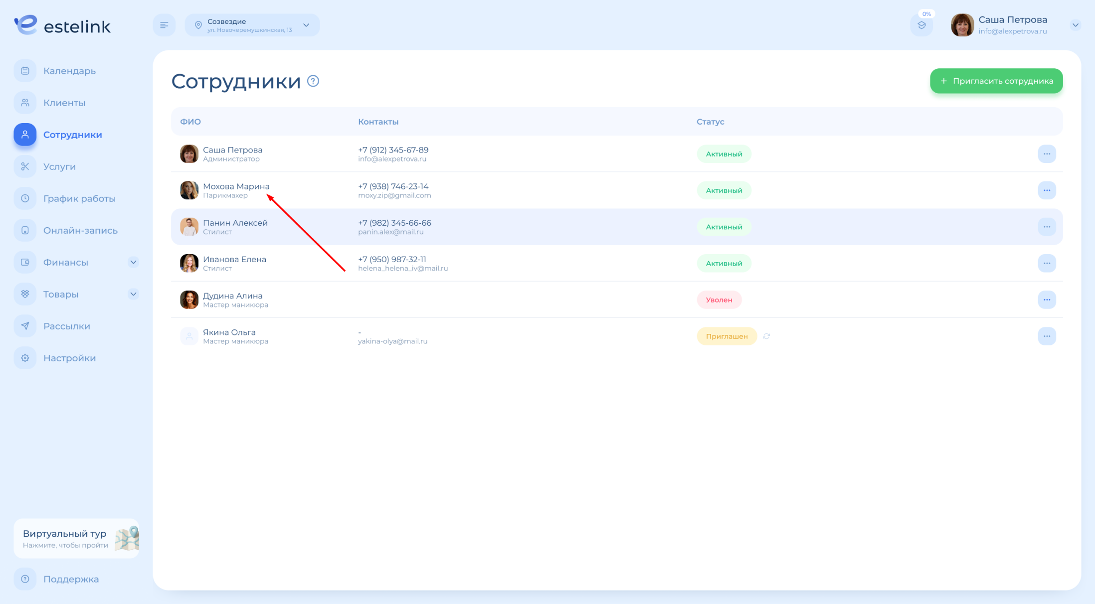 Перейдите во вкладку «Сотрудники» в меню слева и откройте профиль специалиста.