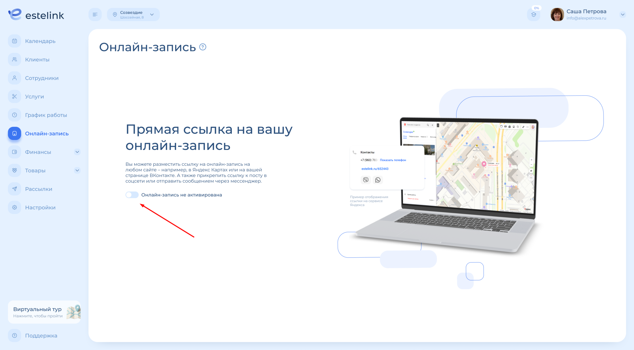 Перейдите во вкладку «Онлайн-запись» в меню слева и нажмите на кнопку активации.
