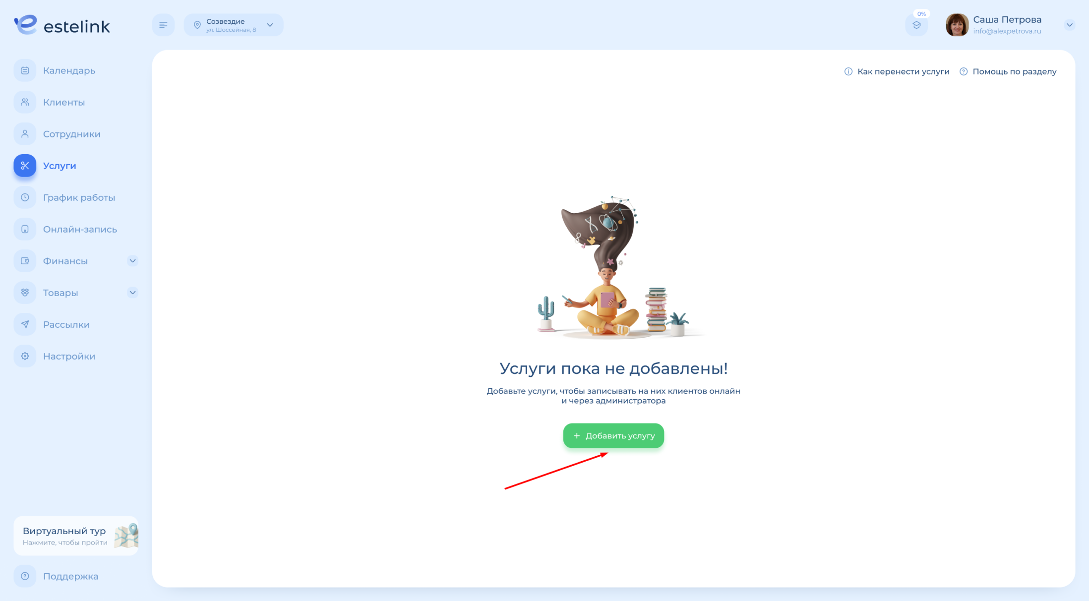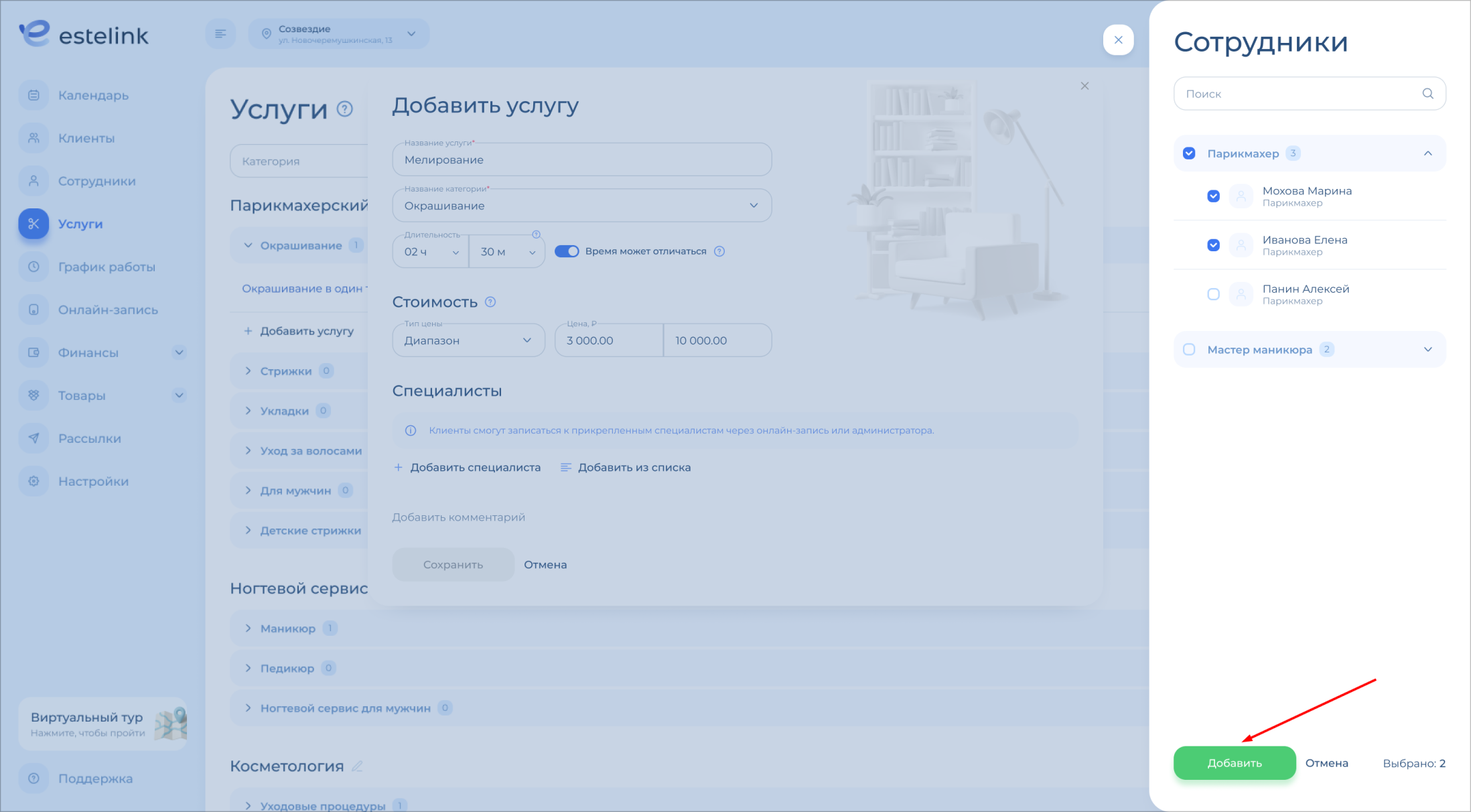 Если вы еще не добавили специалистов в Estelink, сохраните услуги без них, а затем вернитесь к этой части.