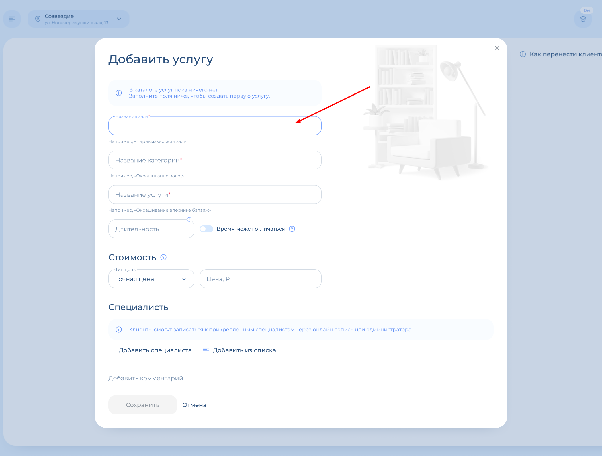 Все поля заполняются, как и в инструкции выше — только нужно будет создать зал. Зал – это верхняя часть иерархии в каталоге услуг. Например, «Парикмахерский зал». Внутри залов размещаются категории, а внутри категорий услуги.
