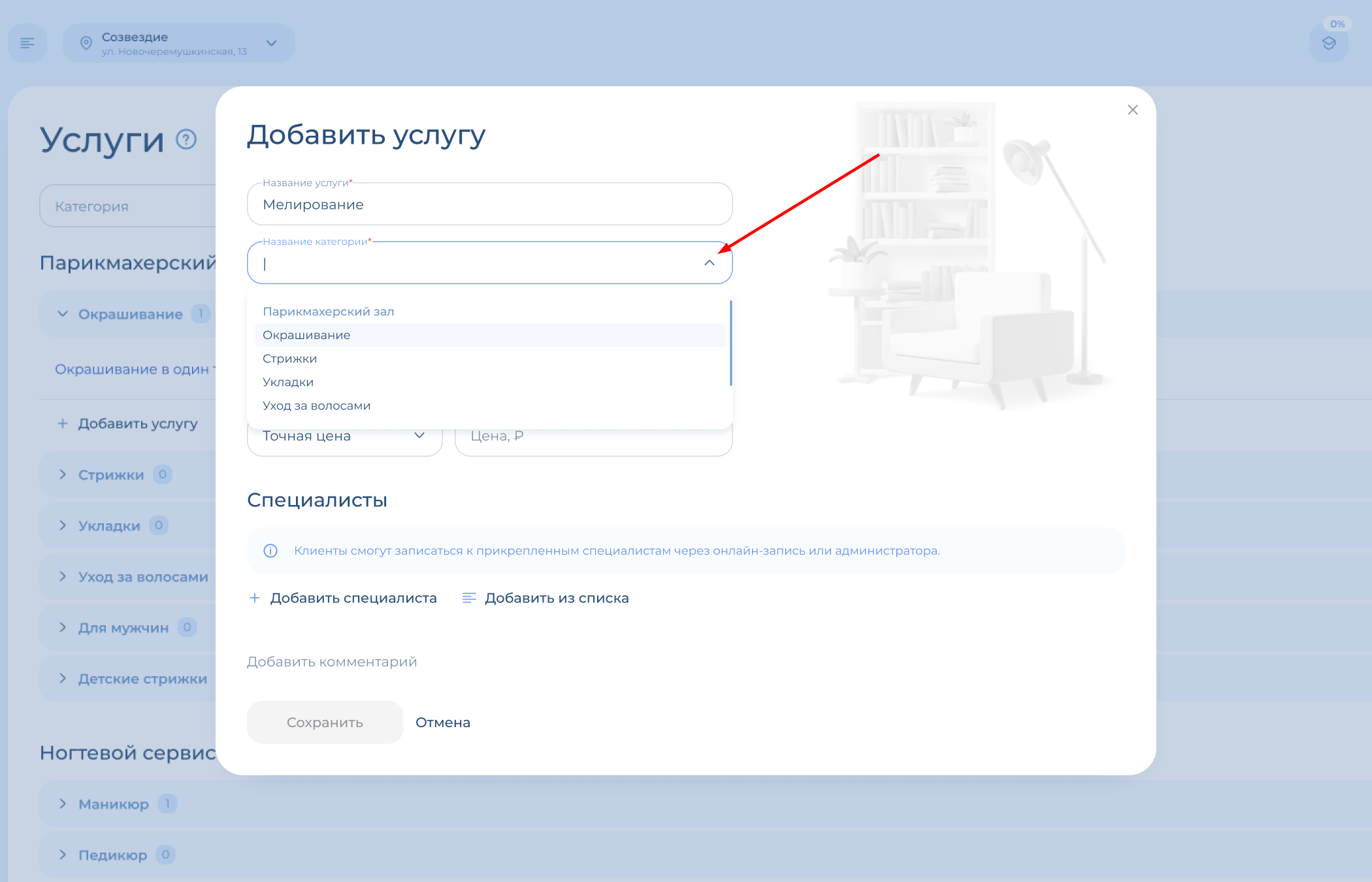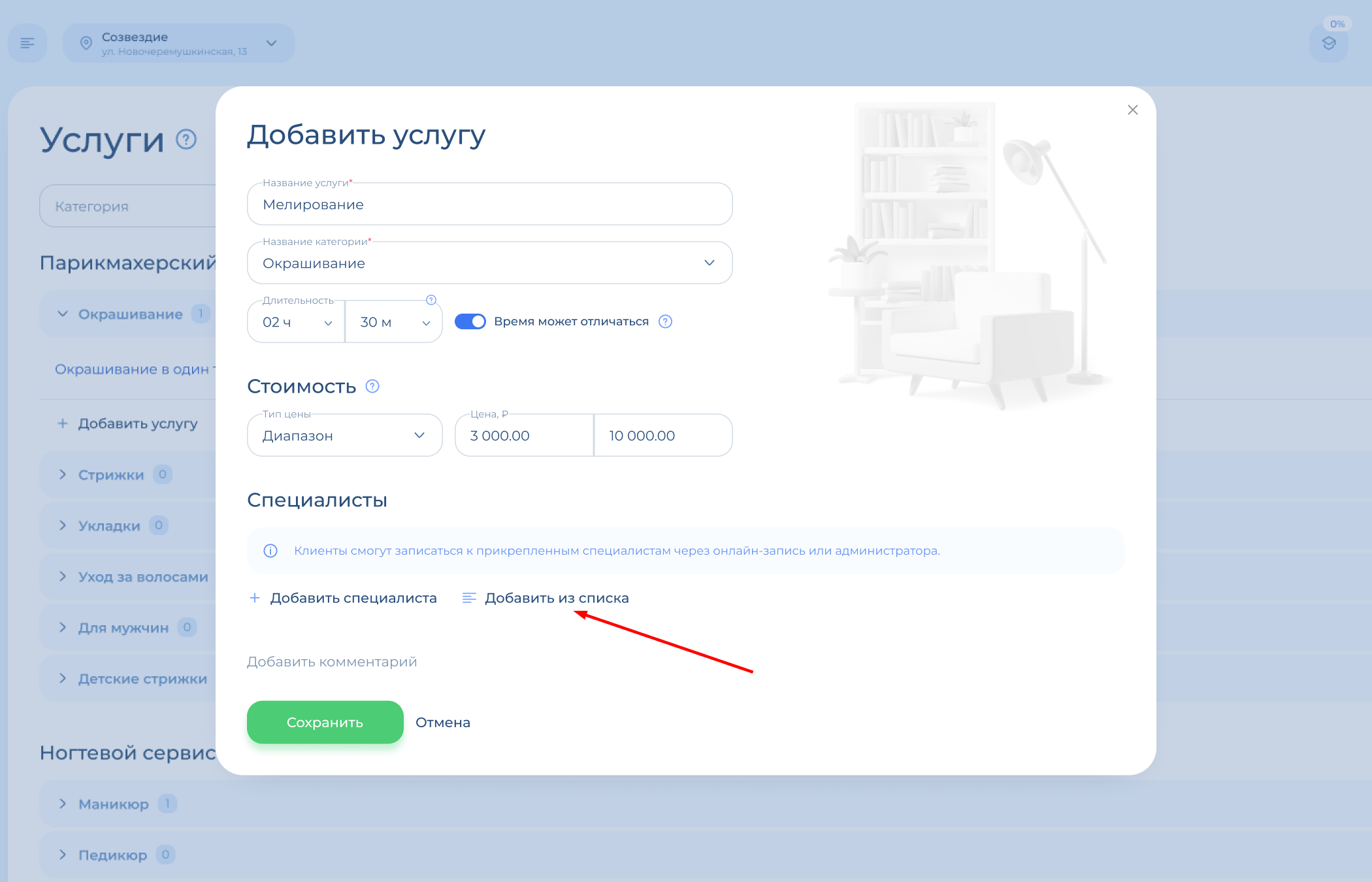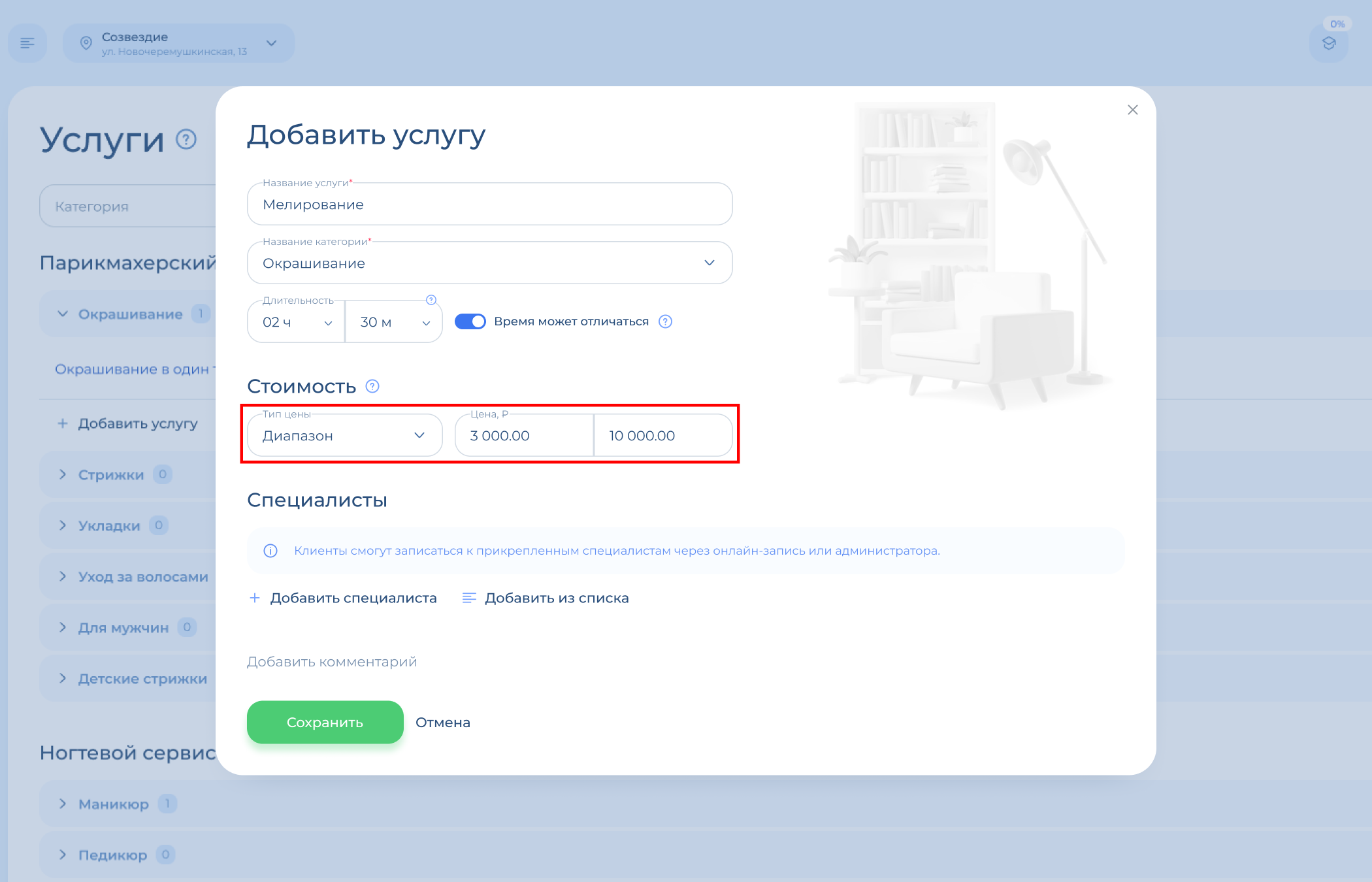 Также вы можете задать здесь цену на услугу — как и длительность, она будет автоматически подтягиваться ко всем прикрепленным специалистам.