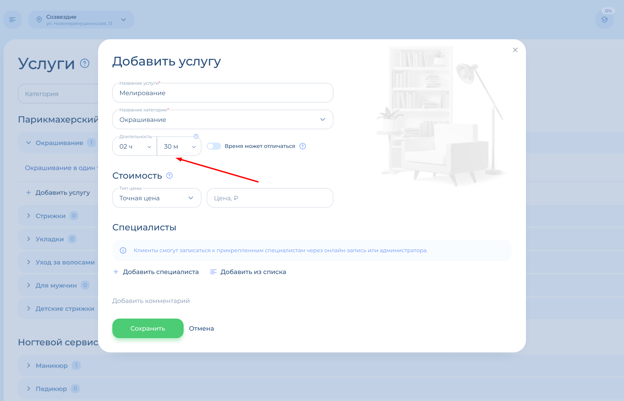Вы можете задать длительность услуги — она будет автоматически подтягиваться ко всем прикрепленным специалистам.