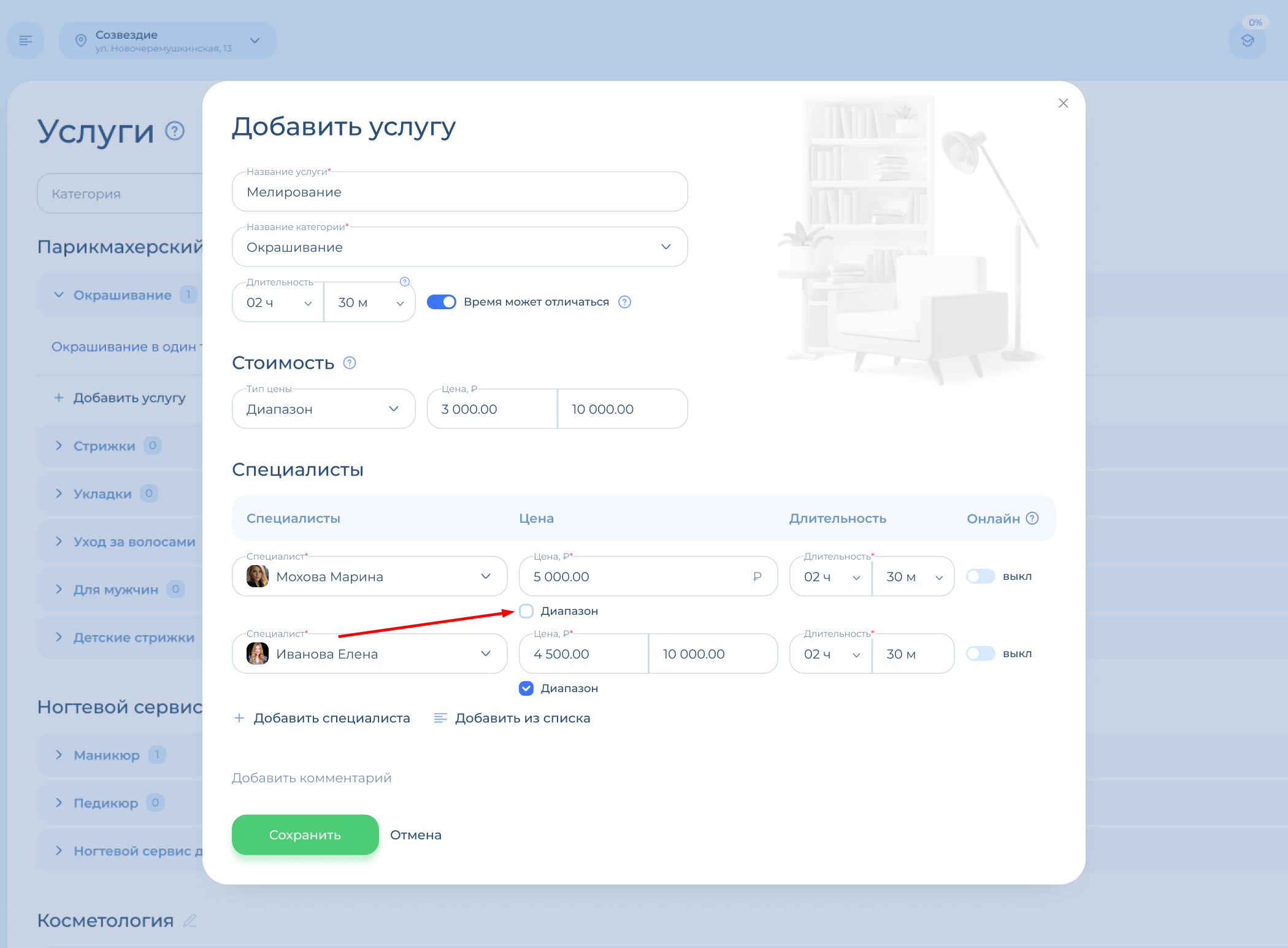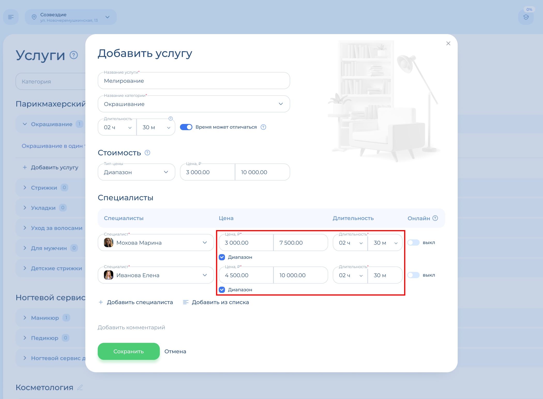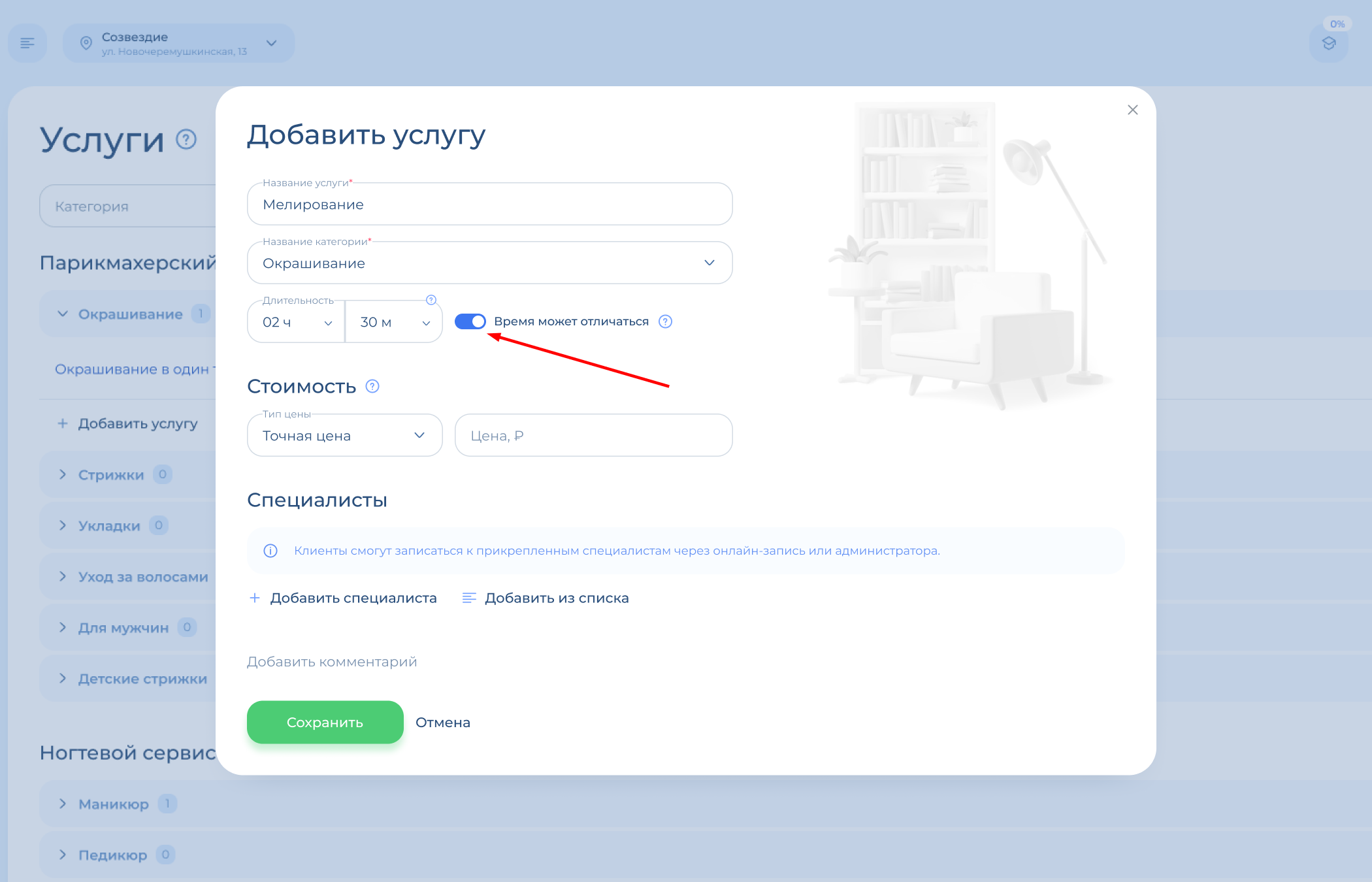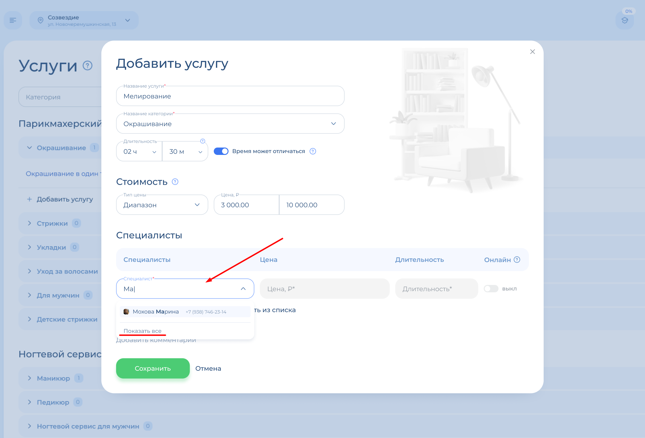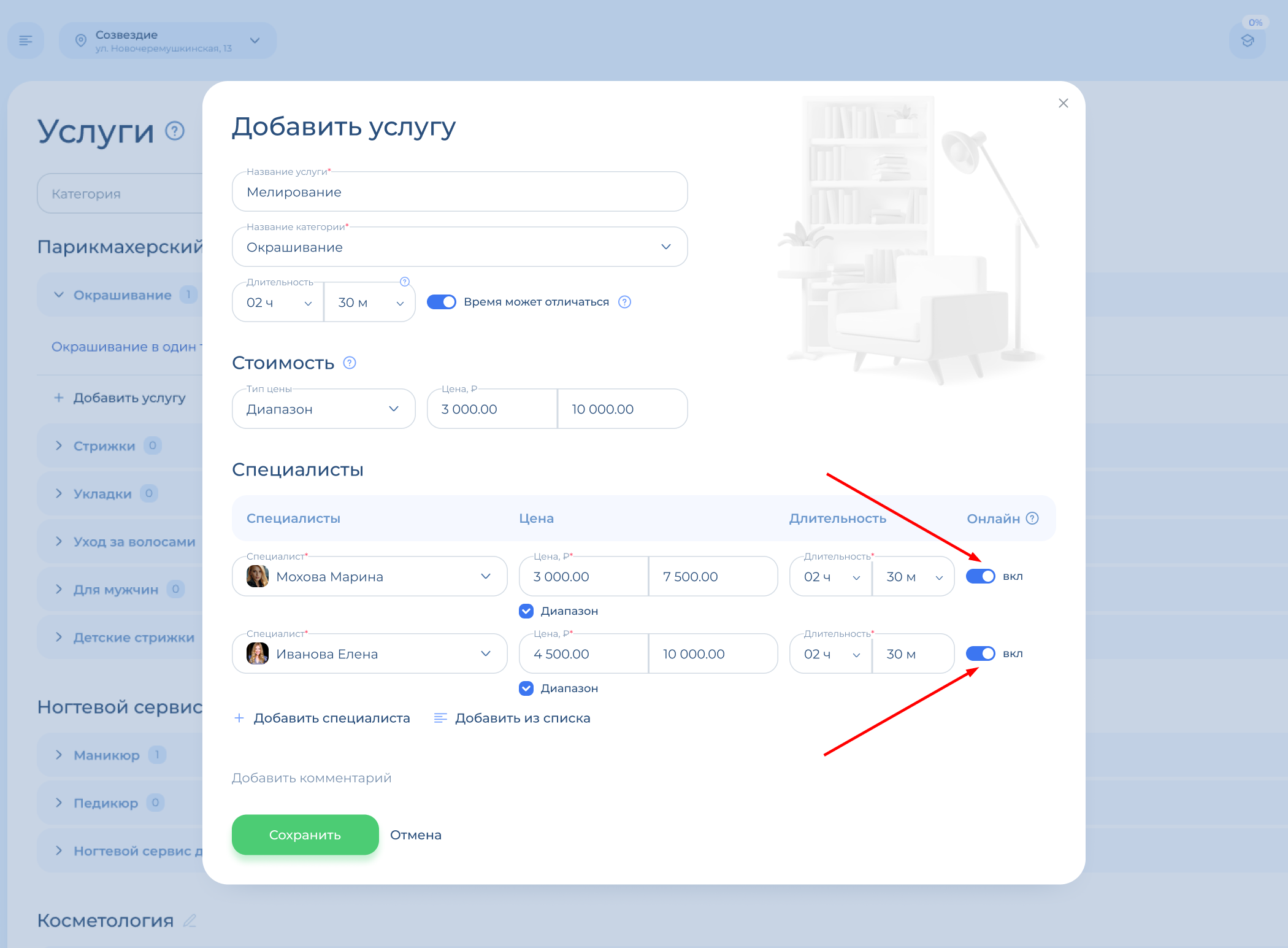 После заполнения цены и длительности у специалистов включите онлайн-запись на услугу — затем нажмите «Сохранить».