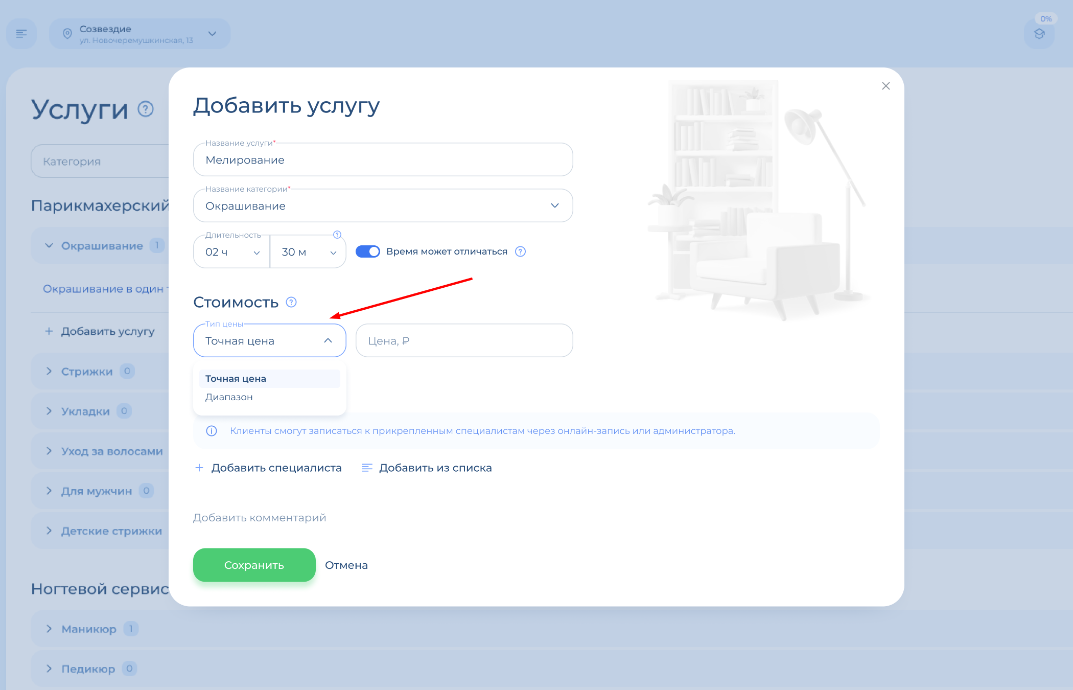 Перейдем к стоимости. Выберите тип цены на услугу — точная цена или диапазон.