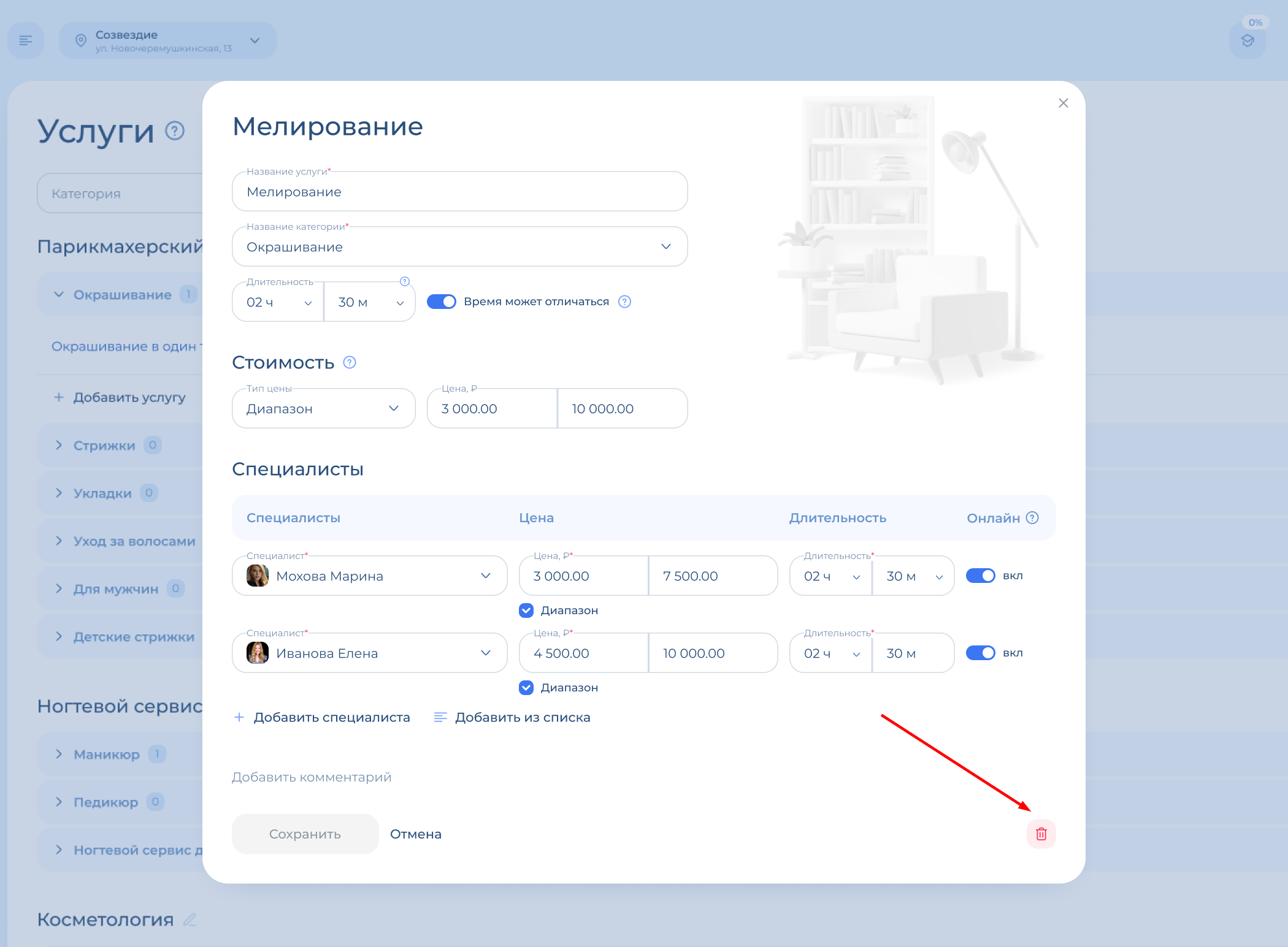 Чтобы удалить услугу, нажмите на значок корзины в углу карточки.