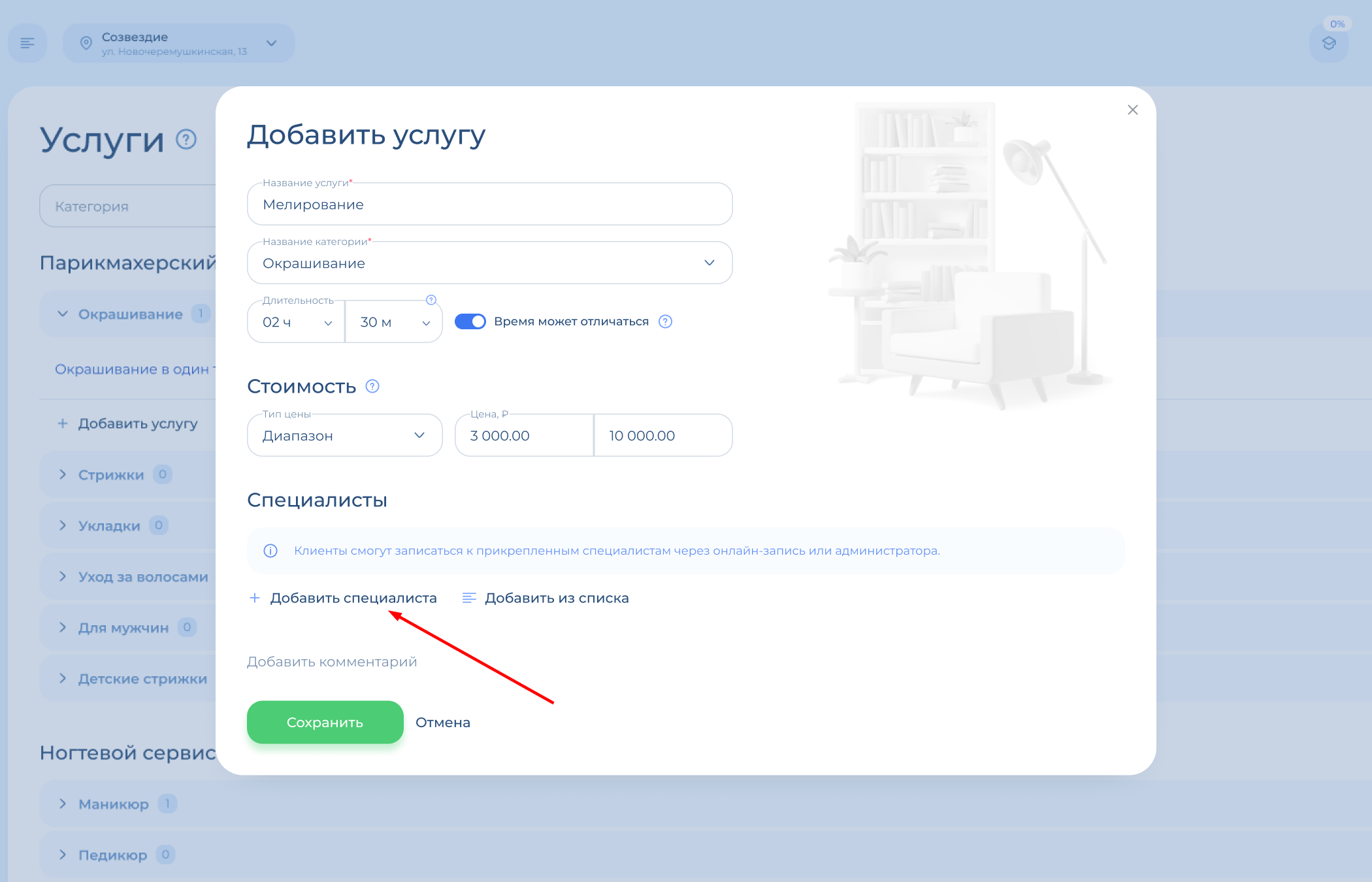 Далее прикрепим специалистов — мастеров, которые оказывают эту услугу. Для этого нажмите на «Добавить специалиста»